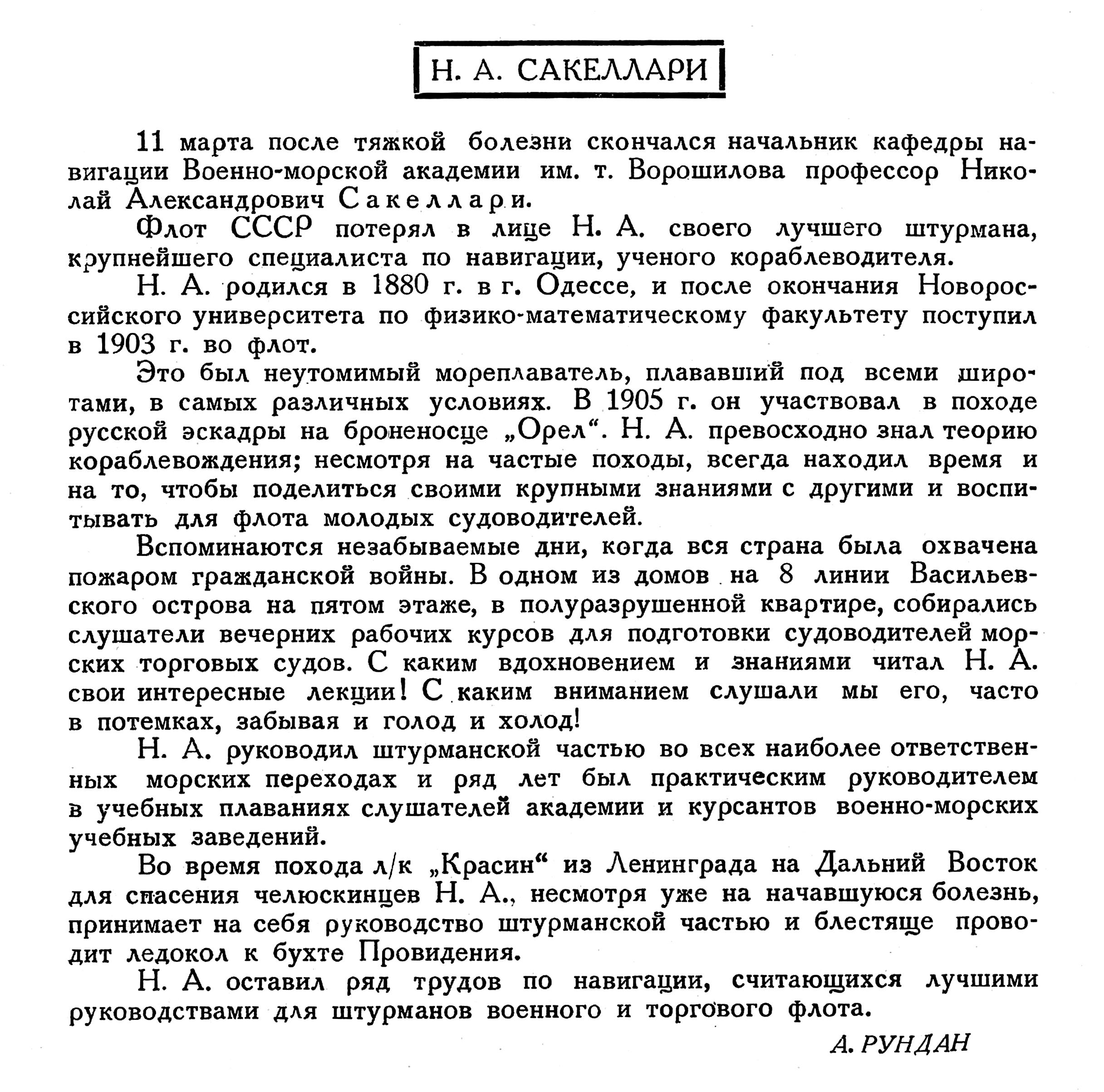 Вчера в Ленинграде скончался профессор Военно-Морской академии им. Ворошилова, лучший штурман Советского Союза — Николай Александрович Сакеллари. С первых дней создания рабоче-крестьянского флота проф. Сакеллари активно участвовал в его восстановлений, занимая различные должности в гидрографической службе. Проф. Сакеллари написал большое количество трудов по штурманскому делу и кораблевождении».