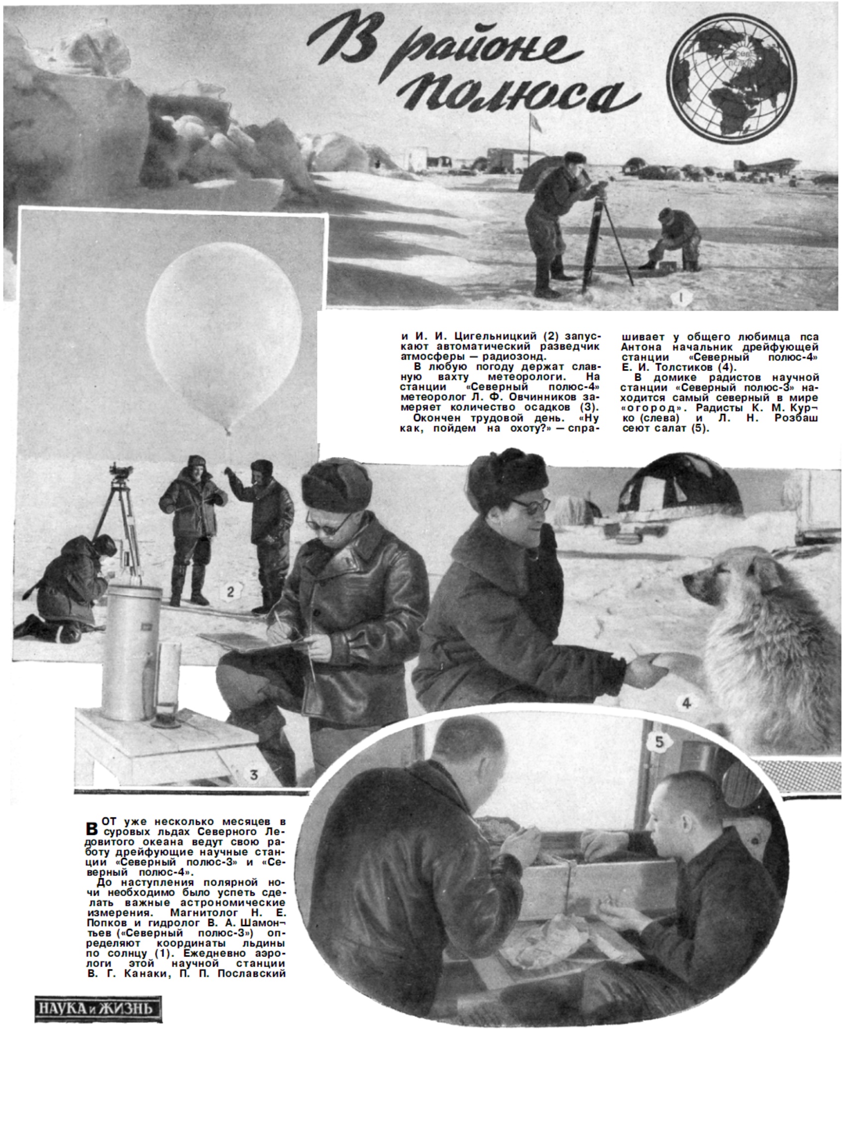 До наступления полярной но­чи необходимо было успеть сде­лать важные астрономические измерения. Магнитолог Н. Е. Попков и гидролог В. А. Шамонтьев («Северный полюс-3») оп­ределяют координаты льдины по солнцу (1). Ежедневно аэро­логи этой научной станции В. Г. Канаки, П. П. Пославский и И. И. Цигельницкий (2) запус­кают автоматический разведчик атмосферы — радиозонд.