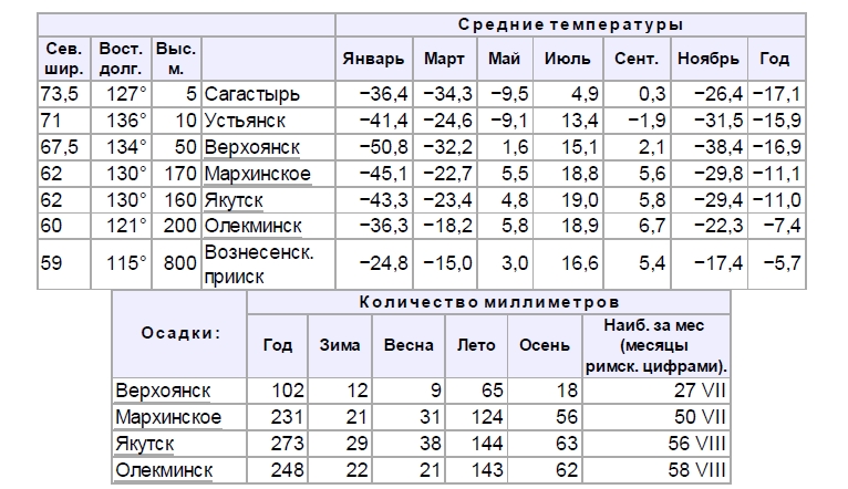 Климат Якутской области самый континентальный из арктических и субарктических стран Старого Света. В климатическом отношении Я. область можно разделить на две полосы, из которых одна соответствует области высокоствольных лесов Вост. Сибири, другая — полярно-тундровой — к полосе оленеводства. К первой полосе относятся округа Якутский, Олекминский, южн. часть Вилюйского и самая южная Верхоянского; ко второй полосе — Верхоянский, Колымский и сев. часть Вилюйского. При подобных условиях культурная жизнь в полярно-тундренной полосе является совершенно невозможной. У Якутска Лена бывает свободна ото льда 160 дней в году, а у Устьянска Яна освобождается всего на 75 дней. Первый снег выпадает в Якутске 29 сентября, в Вилюйске — 24 сент., а в Верхоянске — 15 авг.; последний снег идет в Якутске — 7 мая, в Вилюйске — 24, а в Верхоянске — 31 мая. Число дней между последними морозами весной и первыми осенью доходит в Якутске до 57, в Верхоянске до 37 дней, а в низовьях Лены, Яны, Индигирки и Колымы далеко меньше этой последней цифры. В ноябре и декабре обыкновенно наступают сильные морозы, в феврале морозы становятся слабее, в марте они еще более смягчаются, в апреле и мае наступает весна с сильными ветрами и нередко со снежными бурями или проливными дождями; в июне наступает лето (в северных частях области с незаходящим до половины августа солнцем). Лето короткое, но если оно не сопровождается сев. и сев.-вост. ветрами, то природа быстро оживает и, едва земля освободится от снегового покрова и солнце начнет припекать, как из всех топей и болот поднимаются целые тучи комаров и мошек, сильно беспокоящих как человека, так и всех животных. Вообще Я. область, особенно сев. ее часть, представляет мало удобства для жизни человека. Сухость воздуха, вечная мерзлота земли, неглубокие снега, нетающие глыбы льда в глуши тайги, сильные ветры, все вместе взятое делают здешний климат суровым. Господствующие ветры — сев., сев.-вост. и сев.-зап. Осадки приносятся главн. обр. сев.-зап. ветром в июле, сент. и октябре. Я. обл. издавна известна тем, что здесь самая холодная зима на земном шаре. Самая холодная зима в долинах самой сев. части полосы тайги (из мест наблюдения самое холодное Верхоянск), здесь зима ясная и довольно тихая, самый холодный воздух собирается на дне долин. Севернее, в полосе тайги (напр. Сагастырь, Устьянск, Нижнеколымск) зима несколько теплее, так как при сильных ветрах нижние слои воздуха перемешиваются с выше лежащими, более теплыми. Но для человека такие условия еще неудобнее: −30° при ветре труднее переносятся, чем −50° при затишье. В горах Я. области зима теплее, чем в соседних долинах, как видно из путевого журнала барона Ф. Ф. Врангеля зимой из Нижнеколымска в Якутск: на перевалах было всегда теплее, чем в долинах. Правильных наблюдений в горах Я. области нет. Лето на прибрежье холодное и туманное, вследствие охлаждающего влияния таяния льда на море. Северная граница лесов зависит от влияния холодных ветров с океана. Чем севернее берег, тем севернее и граница (здесь подразумевается не граница высокоствольных лесов, а низкорослых деревьев). Большое влияние имеет Лена, несущая довольно теплую воду с Ю и имеющая высокие берега. К В и З от реки граница лесов на целый градус южнее, чем на берегах ее. Внутри страны, особенно в тайге, лето, принимая во внимание широту, те