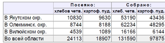 Православных 256737, католиков — 193, армяно-григориан — 2, протестантов — 23, раскольников и сектантов — 1731 (в том числе скопцов 1240), иудеев — 510, магометан — 1896, шаманствующих — 1610. На 100 мжч. в Я. области приходится 96 жнщ. Женщин особенно мало среди войскового сословия, среди регулярного войска и казаков (33 жнщ. на 100 мжч.) и среди ссыльных (40 жнщ. на 100 мжч.). Округа делятся на полицейские участки, участки — на волости и сельские общества, а инородческие местности — на улусы с наслегами и роды. Всего в области 12 полицейских участков, 8 русских и 1 инородческая волость, с 169 населенными местами (в том числе 99 инородческих и 12 населенных ссыльными скопцами), якутских улусов 15, с 251 наслегами (селениями), и 36 родов других инородцев. Мировых судей в области 5; из них 3 проживают в г. Якутске, 1 в г. Олекминске, 1 в г. Вилюйске; верхоянский и колымский исправники исполняют в своих округах обязанности мировых судей. Судебных следователей 2; оба живут в Якутске. 6 наблюдателей церковных школ. 10 врачей; кроме того, имеется врач выселка прокаженных в Вилюйском округе. 3 фельдшерские пункта сс. Сунтарском, Булуне и Нижне-Колымске. 20 церковных благочиний. Областью управляет губернатор. Окружной суд; 4 почтовые и 1 почтово-телеграфные конторы. Отделение попечительства о слепых, тоже Красного Креста с амбулаторией, сиротский детский приют, приют для арестантских детей, якутское благотворит. общество, сельскохозяйственное общество, публичная библиотека, редакции «Епархиальных Ведомостей» и «Якутских Областн. Ведомостей», типография при областном правлении, бесплатная народная библиотека с читальней и общ. собрание; все эти учреждения сосредоточены в областном городе. Земледелие. Упрочению земледелия в крае предшествовала долгая борьба с вредными влияниями естественных условий и с предубеждением инородцев против необычного для них занятия. В течение первого столетия по приходе сюда русских земледелия не существовало; хлебные запасы доставлялись из Иркутской и Енисейской губерний. В 1735 г. из Илимского края были переселены в Амганскую слободу пашенные люди. В 1780 г. посеяно было во всей области всего 735 пд. хлеба, собрано 2822 пд. В 40-х годах XIX в. Миддендорф свидетельствует, что в Як. округе высевалось 4500 пд. разного хлеба и собиралось до 14000 пуд. В 1855 г. в Вилюйском крае земледелие успело уже укорениться, в особенности в Мархинском и Сунтарском улусах, в которых оно и ныне процветает. В 1861 г. были переселены из Туруханского края скопцы, оказавшие большое влияние на местное земледелие; они сразу повели его в широких размерах, при чем потребовалось много наемных рабочих, главную массу которых составляли якуты. Пройдя суровую школу в скопческих хозяйствах, эти рабочие приобрели опытность и сделались потом самостоятельными хозяевами. Скопцы имели в этом отношении благотворное влияние и на русских своих соседей. В 1888 г. собиралось разных хлебов 46673 четв., из них у якутов 20890 четв.; в 1899 г. — 134762 четв., из них у якутов — 83473 четв. Якуты сделались хорошими земледельцами: они расчищают земли из-под леса, осушают низины и болота, заводят на них луга, затем превращают их в пашни. Якутские хозяйства в приленских наслегах по своим размерам и способам обработки земли мало в чем уступают скопческим, которые считаются лучшими в области. Наиболее развито земледелие в Олекминском округе; яку