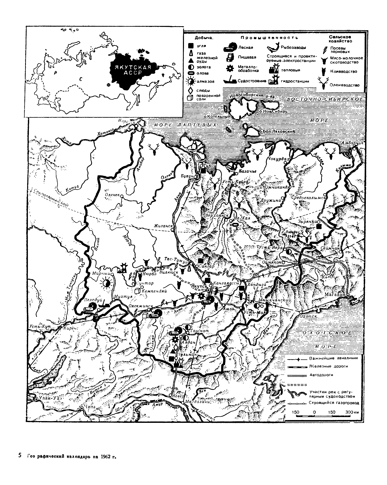Минеральные богатства Я. области громадны. В Витимско-Олекминской системе золота добывается до 550 и более пудов ежегодно; металл этот находится также по притокам верховий реки Учура, в верховьях р. Алдана, в некоторых местах Вилюйского округа и по северным склонам Станового хребта. Не менее богата область и серебряно-свинцовыми рудами. Еще в XVIII стол. основан был в Верхоянском округе по р. Эндыбалу сереброплавильный завод, обрабатывавший руду с 22% серебра в течение 10 лет. В Становом хр. за р. Маей находятся залежи платины, добываемой тунгусами для своих пуль. Железо встречается в области почти повсюду в виде бурого, красного и магнитного железняка; в особенности богат железными рудами вост. склон Алазейского хр. Железные руды добываются якутами и обрабатываются самым первобытным способом. Якуты выделывают большую часть железных вещей и инструментов, употребляемых в крае. В Вилюйском и Олекминском окр. находятся также хорошие железные руды. На р. Алдане добывают и обрабатывают самым грубым способом медную руду. Те же руды встречаются в Вилюйском окр. Киноварь встречается на р. Амге. Свинец находится во многих местах области и разрабатывается инородцами для их надобностей. Встречаются также в большом числе различные ценные цветные камни, как-то: яшма, горный хрусталь, топаз, аметист, опалы и изумруды — в Вилюйском окр., агаты и сердолики — по нижнему течению Лены. Особенно богата область солью и каменным углем. Залежи соли занимают обширный бассейн по притокам р. Вилюя, где находятся известные Кемпендяйский и Багинский соляные ключи с содержанием до 25% соли; но разработка и выпаривание соли производится самым нерациональным способом. Значительные отложения каменного угля встречаются во многих местах по Лене, Алдану и Вилюю, а также в предгорьях Верхоянского хребта. Уголь попадается различного качества и большей частью принадлежит к разряду бурых. Графит встречается в Олекминском и в Вилюйском окр. В устьях Лены находят янтарь, встречаемый и по всему побережью Сев. Лед. океана в виде мелких кусков. По Лене встречаются залежи каолина и кроме того известняк, высокого достоинства огнеупорная глина, жерновый и строительный камень, шифер, асфальт, горное масло, минеральные краски. Горячие минеральные ключи, железные и серные, на Лене и в Мегинском улусе Я. округа. К ископаемым богатствам области относится также имеющая важное значение в вывозной торговле мамонтова кость, клыки мамонта, сохранившиеся со времени четвертичной эпохи в мерзлых пластах сев. части области вместе с другими костями этого же животного, а также кости зубра, овцебыка и носорога. Особенно много этих останков встречается на островах Ледовитого океана, куда промышленники ежегодно отправляются для добывания «кости». В некоторых местах трупы мамонтов сохранились целиком, но находки нередко погибали ранее, чем до них добирались посланные из Петербурга ученые. Флора обл. не разнообразна: на лугах преобладают цветковые и тайнобрачные; они развиваются за короткое лето чрезвычайно быстро, столь же быстро отцветают. Из хвойных пород известны лиственница, ель, сосна и кедр; из лиственных — береза, осина, ольха, ива, черемуха, боярышник, рябина, шиповник и серебристый тополь. Полоса высокоствольных лесов покрыта сплошными, густыми, непроходимыми лесами и обширными болот