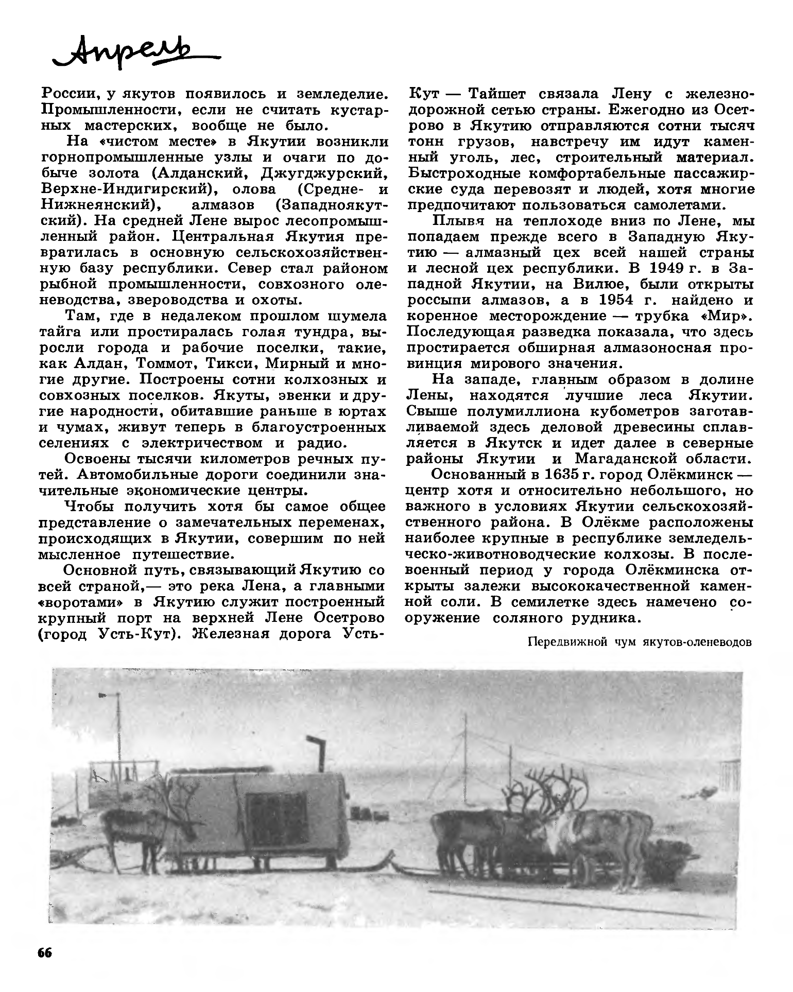Якуты засевают 16354 четв. хлеба и 3720 пд. картофеля, собирают 79988 четв. хлеба и 19490 пд. картофеля. Скопцы — почти исключительно земледельцы; среди них на 1 душу муж. пола приходится посева хлеба 3,9 четв. и картофеля 9,3 пд., тогда как у других жителей области всего 0,2 четв. хлеба и 0,1 пд. картофеля. Средний урожай хлебов составлял сам-5,3, урожай картофеля сам-5. Огородничество развито весьма слабо, преимущественно у старообрядцев Павловского селения, скопцов и только отчасти крестьян; якуты им почти не занимаются. Скотоводство. За исключением крайнего севера, где якуты, подобно прочим инородцам, занимаются звероловством и оленеводством, в остальных частях области скотоводство дает якутам главные средства существования; но эта отрасль якутского хозяйства не развивается, переживая периодически повальные эпизоотии, а нередко и голодовки от бескормицы, вследствие недостатка лугов. Краткость якутского лета вынуждает население напрягать до последней крайности свои силы, чтобы успеть убрать сено. Сознавая всю важность спешной уборки сена, якуты заменили горбушу косой литовкой и даже начинают выписывать из иркутского казенного склада сенокосилки и конные грабли. В последнее время якуты занялись расчисткой своих лугов от кустов и кочек, а также спуском озер, с целью увеличения площади сенокосов. Рогатый скот мелок, мало молочен. Коневодство составляет принадлежность более зажиточных хозяйств и носит подсобный характер. Якутская лошадь отличается массивностью, небыстрым бегом и необыкновенно длинной и густой шерстью. Конское мясо, жир и молоко употребляются якутами в пищу. Уход за лошадьми у скопцов значительно лучше и лошади их, как рабочая сила, лучше якутских. Оленеводством, кроме прибрежных якутов, занимаются тунгузы, ламуты и в особенности чукчи; не будь оленей, бесплодная северная тундра была бы необитаема. Дикий и прирученный олень доставляет этим инородцам все необходимое для жизни. С тех пор, как прекратились массовые перекочевки диких оленей, дикого оленя заменил домашний. У чукчей оленеводство достигло высокой степени и дает им возможность переживать те голодовки, которым периодически подвергаются как инородцы, так и русские в Колымском крае; последних чукчи не раз спасали от голодной смерти. Этому промыслу угрожает страшная опасность от часто повторяющихся эпизоотий — сибирской язвы и ящура, истребляющих стада до последнего животного. В 1900 г. числилось в области (по весьма неточным данным): лошадей — 105387, рогат. скота крупного и мелкого — 299430 гол., овец — 256, свиней — 283, оленей ездовых — 25675, собак ездовых — 2700. Из всего этого количества в Якутском окр. 262450 гол., в Олекминском — 26441 гол., в Вилюйском — 93610 гол., в Верхоянском — 37198 гол., в Колымском — 15037 гол. Рыбопромышленность имеет серьезное значение в экономической жизни обл. В Вилюйском окр. лов озерной рыбы составляет немаловажное подспорье в местном продовольствии. В Верхоянском окр. рыбный промысел доставляет заработок населению и еще большее значение имеет как источник продовольствия. Рыбный промысел в особенности развит в сев. части этого округа, где население поголовно занято им и где он, за отсутствием хлебопашества и скотоводства, служит почти единственным источником продовольствия. То же значение рыбопромышленность имеет и в Колымском окр. Рыбу употребляют в све