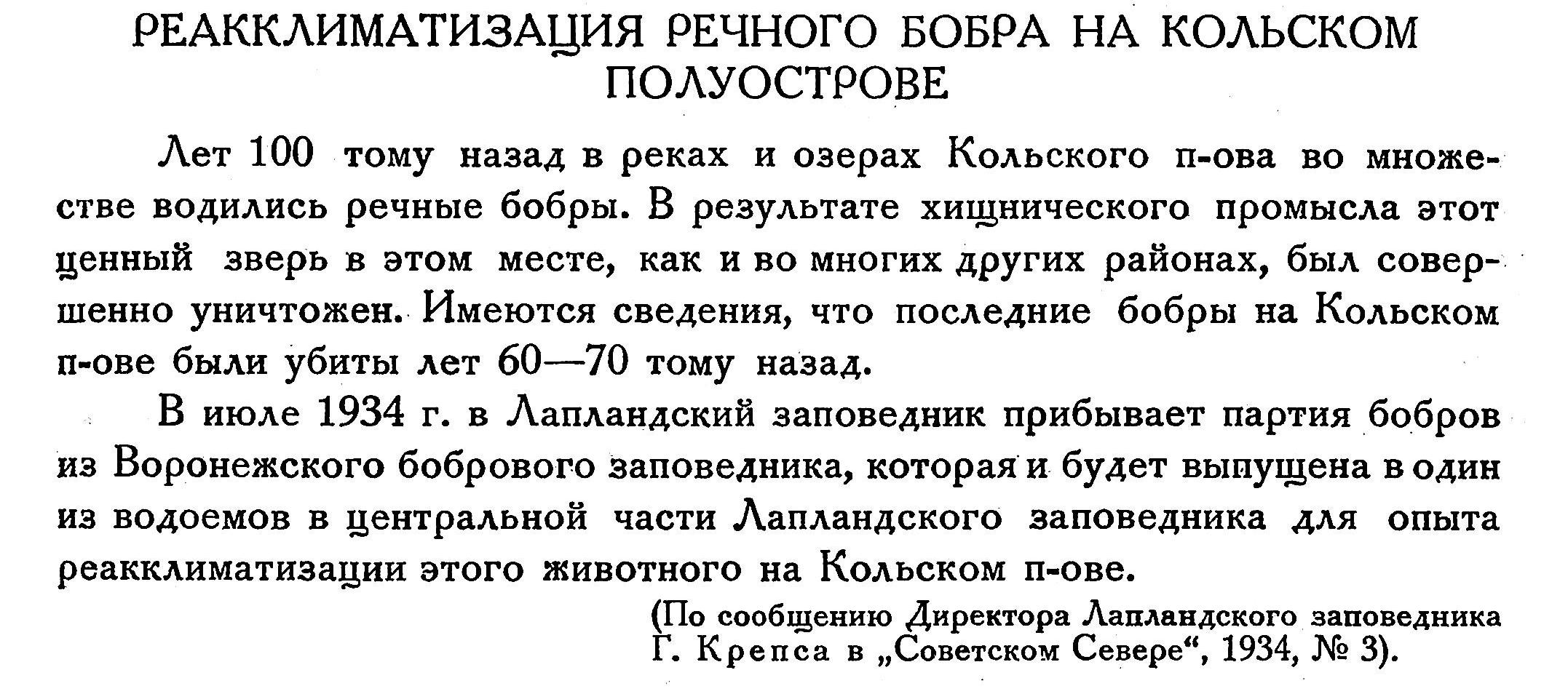 В июле 1934 г. в Лапландский заповедник прибывает партия бобров из Воронежского бобрового заповедника, которая и будет выпущена в один из водоемов в центральной части Лапландского заповедника для опыта реакклиматизации этого животного на Кольском п-ове.