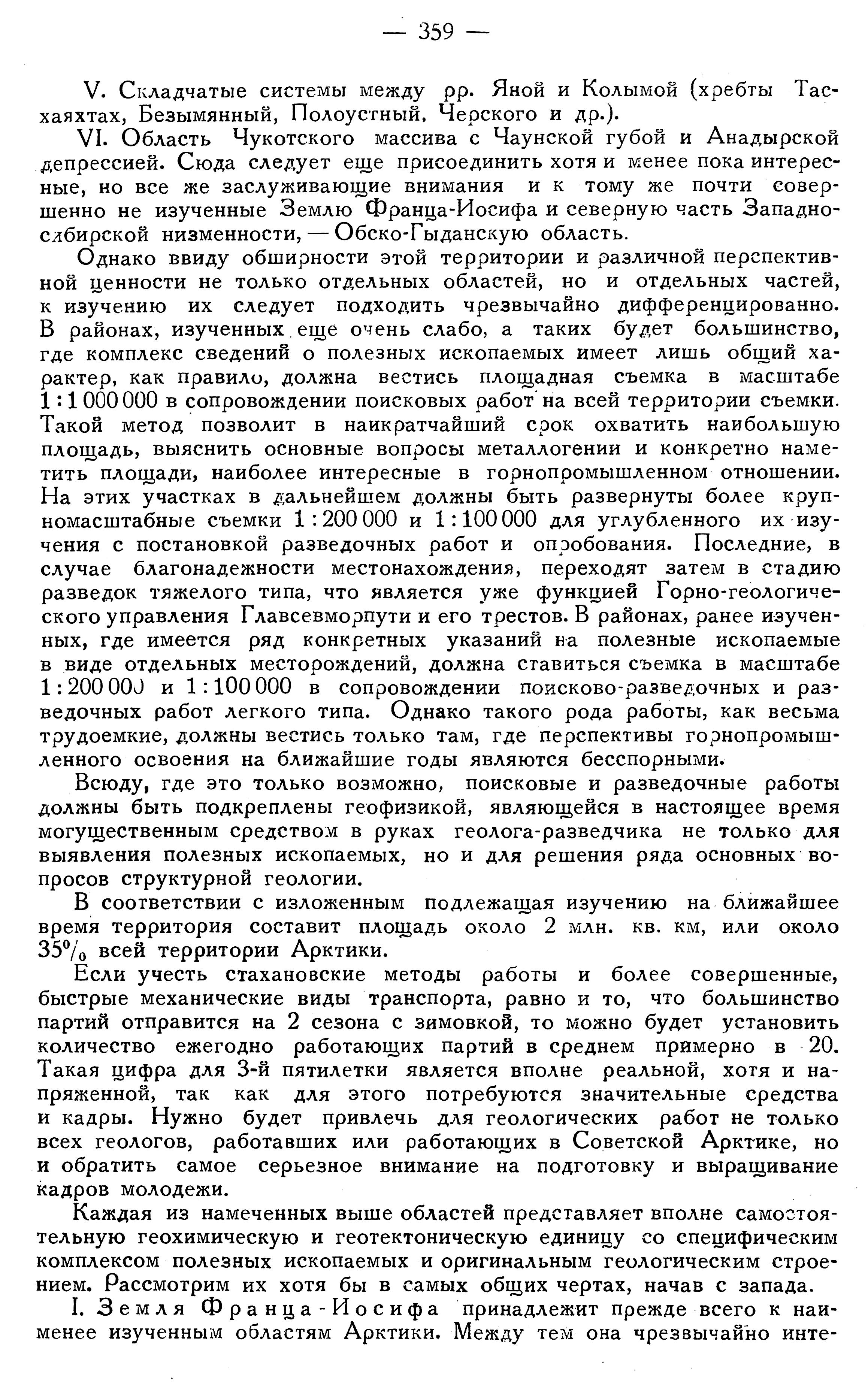 Если учесть стахановские методы работы и более совершенные, быстрые механические виды транспорта, равно и то, что большинство партий отправится на 2 сезона с зимовкой, то можно будет установить количество ежегодно работающих партий в среднем примерно в 20. Такая цифра для 3-й пятилетки является вполне реальной, хотя и напряженной, так как для этого потребуются значительные средства и кадры. Нужно будет привлечь для геологических работ не только всех геологов, работавших или работающих в Советской Арктике, но и обратить самое серьезное внимание на подготовку и выращивание кадров молодежи.
