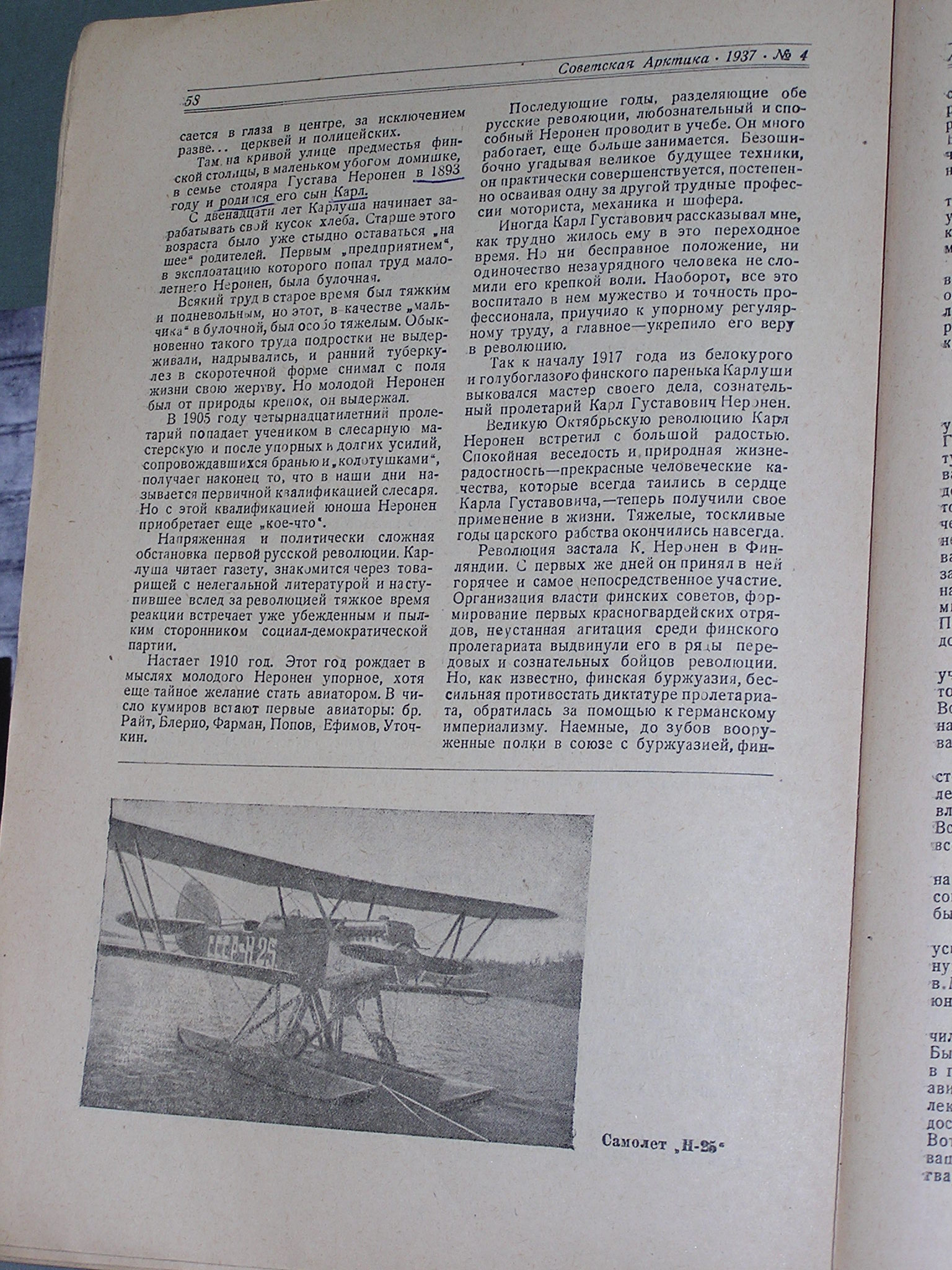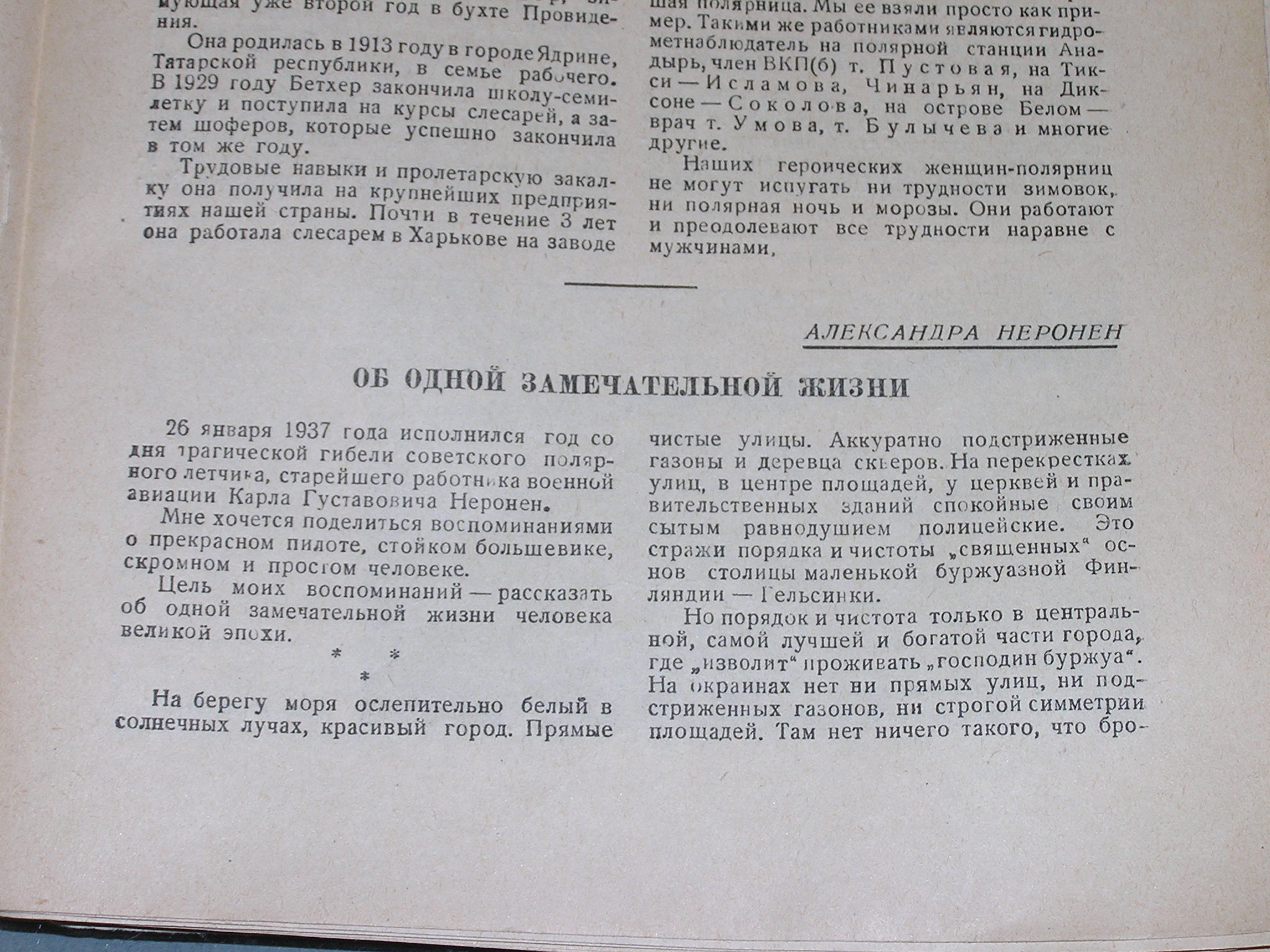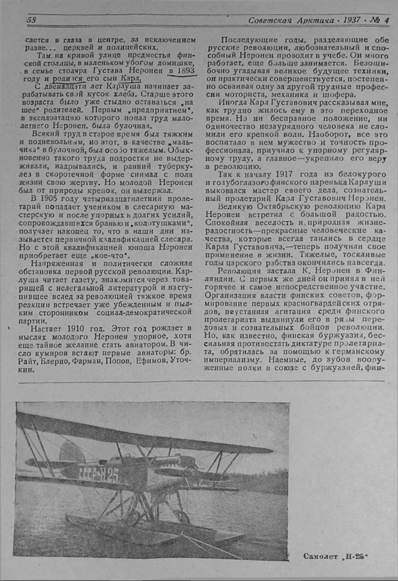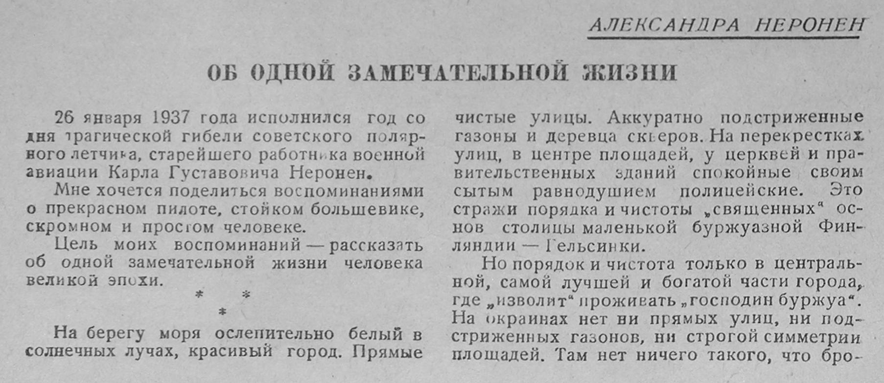 АЛЕКСАНДРА НЕРОНЕНОБ ОДНОЙ ЗАМЕЧАТЕЛЬНОЙ ЖИЗНИ26 января 1937 года исполнился год со дня трагической гибели советского полярного летчика, старейшего работника военной авиации Карла Густавовича Неронен.