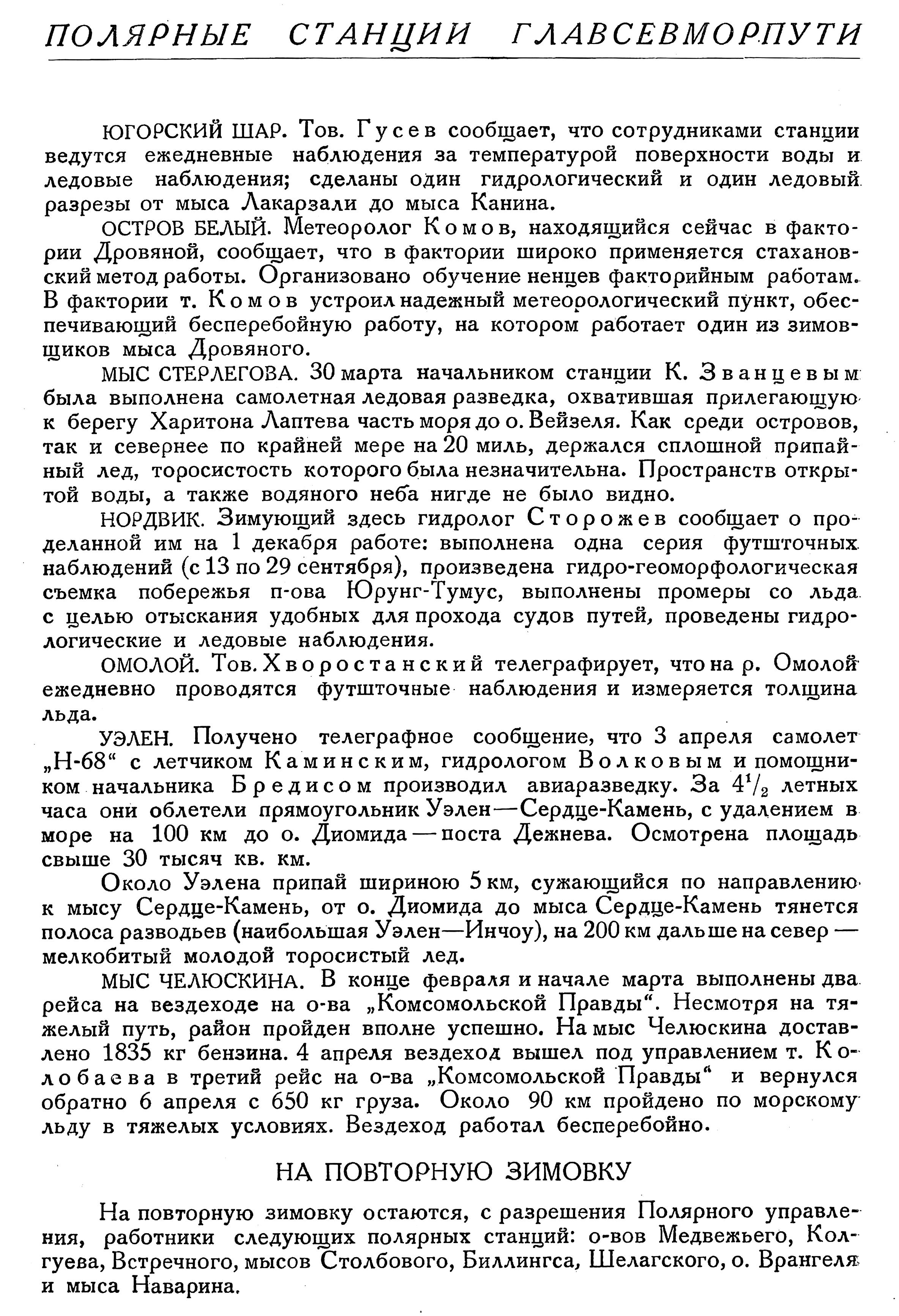 МЫС СТЕРЛЕГОВА. 30 марта начальником станции К. Званцевым была выполнена самолетная ледовая разведка, охватившая прилегающую к берегу Харитона Лаптева часть моря до о. Вейзеля. Как среди островов, так и севернее по крайней мере на 20 миль, держался сплошной припайный лед, торосистость которого была незначительна. Пространств открытой воды, а также водяного неба нигде не было видно.