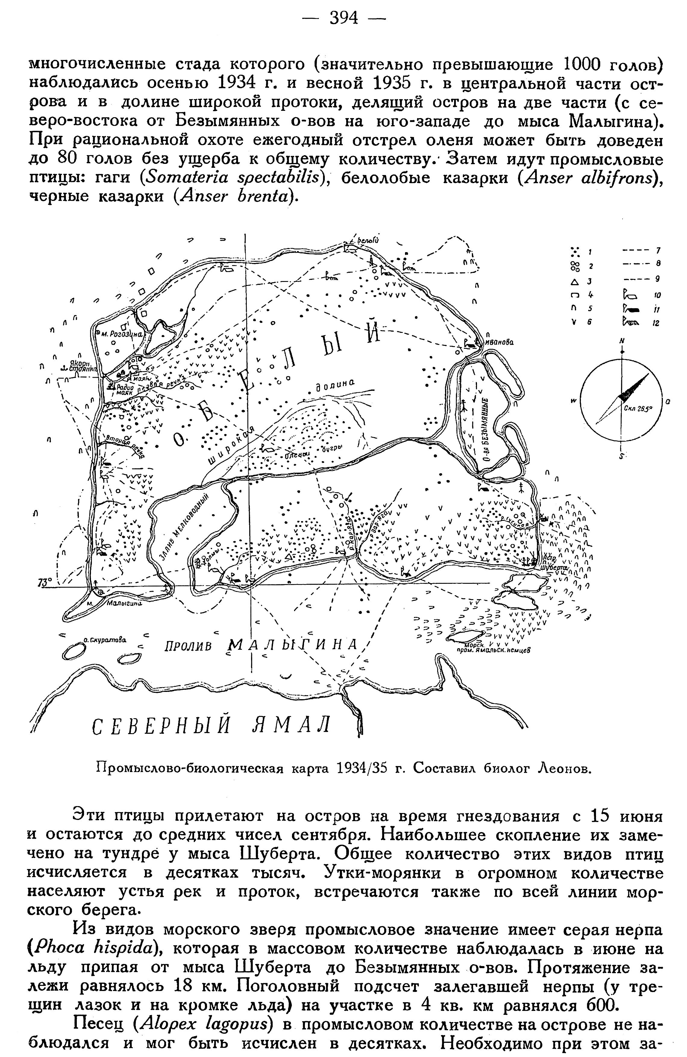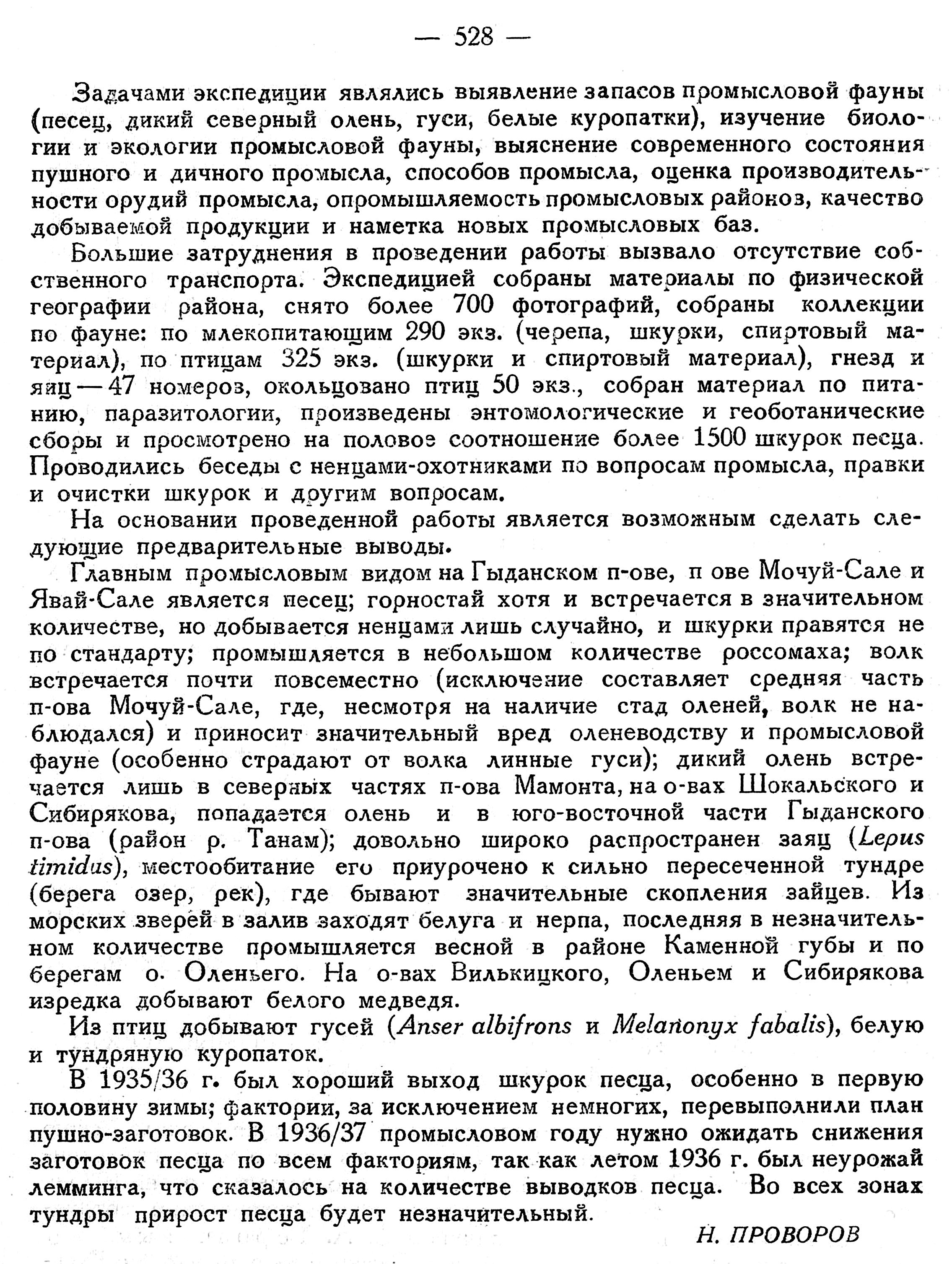 На основании собранных экспедицией материалов в настоящее время представляется возможным сделать следующие предварительные данные о состоянии промыслов Ямальского округа. Основным промысловым видом в Ямальском округе является песец; незначительный процент по ценности к общему выходу пушнины занимают иные звери — заяц (Lepus timidus), горностай (Mustela erminea), лисица (Vulpes vulpes) и другие. Промысел птиц развит очень слабо, гуси почти не промышляются. В северных частях округа и на о-вах Шокальского, Оленьем и Белом сохранились еще олени (Rangifer tarandus). По всему округу распространен волк (Canis lupus), наносящий заметный урон как оленеводству, так и дикому стаду млекопитающих и птиц. На территории всего округа, за исключением, быть может, п-ова М. Ямал, наблюдается недопромысел песца. В 1934—1935 гг. план пушнозаготовок не выполнен по ряду причин, из которых главнейшими являются: агитация богачей ненцев и шаманов, малооленность основного ядра промышленников, охватывающих в силу этого лишь незначительные промысловые участки, устарелые способы промысла, отсутствие ягельников и дров на обширных площадях в северных частях тундры, плохая работа факторий и, наконец, задержка песца в северной тундре. Последнее обстоятельство было вызвано, очевидно, тем, что на севере Ямальского округа в 1934 г. был хороший "урожай" лемминга (Lemmus obensis, Dicrostonyx torquatus) и, вследствие мягкой осени и задержки у Карского моря на зиму оленеводов со стадами, обилие куропаток {Lagopus albus et L. mutus), появившихся в устье р. Таз лишь в середине февраля.