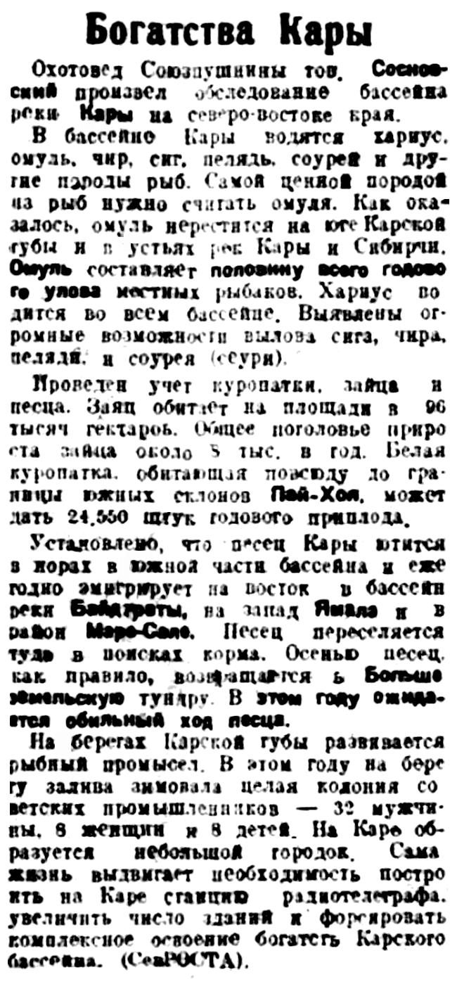 На берегах Карской губы развивается рыбный промысел. В этом году на берегу залива зимовала целая колония советских промышленников — 32 мужчины, 8 женщин и 8 детей. На Каре образуется небольшой городок. Сама жизнь выдвигает необходимость построить на Каре станцию радиотелеграфа, увеличить число зданий и форсировать комплексное освоение богатств Карского бассейна. (СевРОСТА).