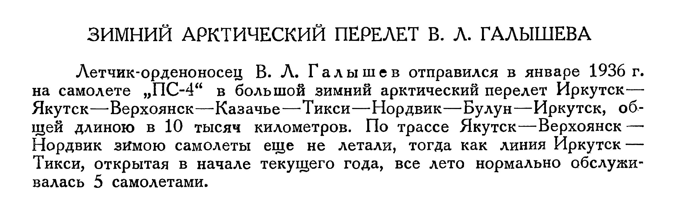 Летчик-орденоносец В. Л. Галышев отправился в январе 1936 г. на самолете "ПС-4" в большой зимний арктический перелет Иркутск— Якутск—Верхоянск—Казачье—Тикси—Нордвик—Булун—Иркутск, об­щей длиною в 10 тысяч километров. По трассе Якутск—Верхоянск — Нордвик зимою самолеты еще не летали, тогда как линия Иркутск — Тикси, открытая в начале текущего года, все лето нормально обслужи­валась 5 самолетами.
