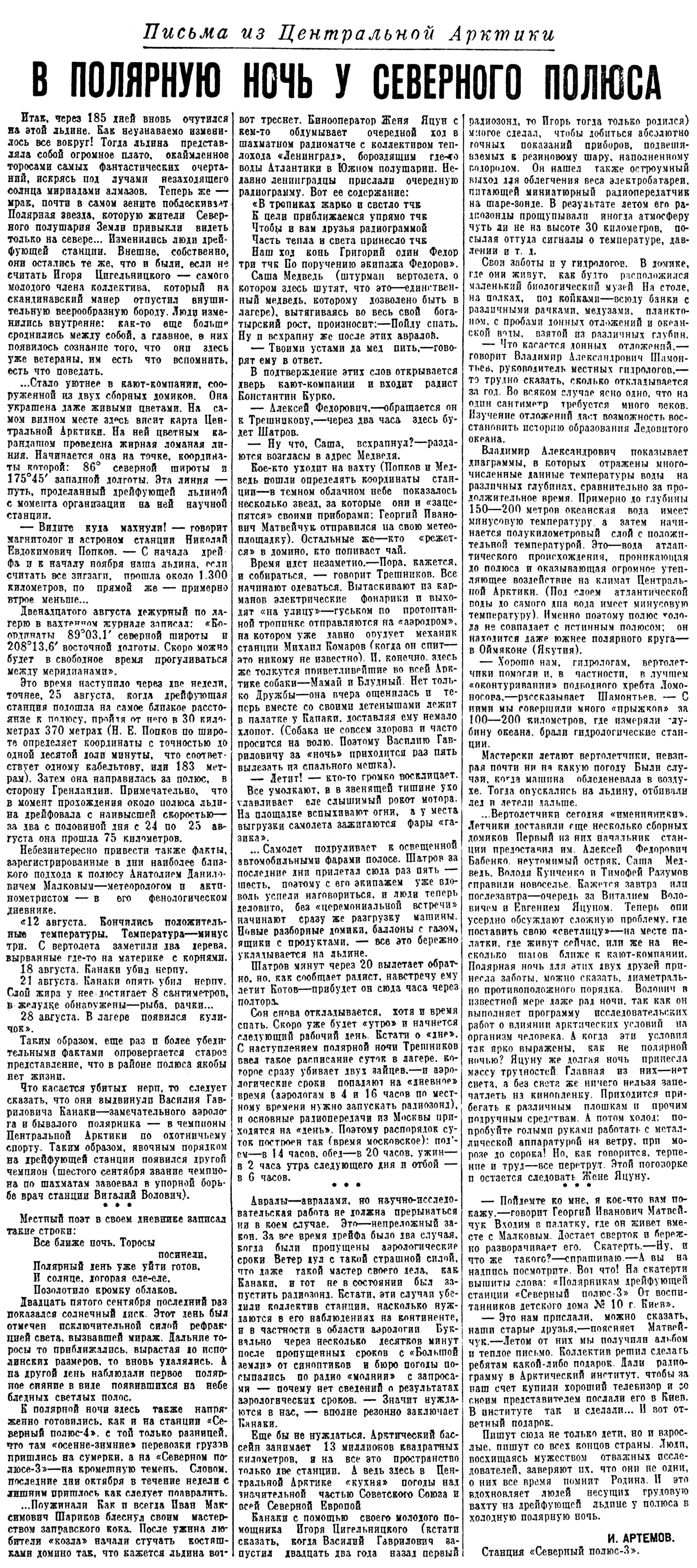 19 июля корреспондент ТАСС связался по радио с начальником дрейфующей научной станции в Центральной Арктике А. Ф. Трешниковым.