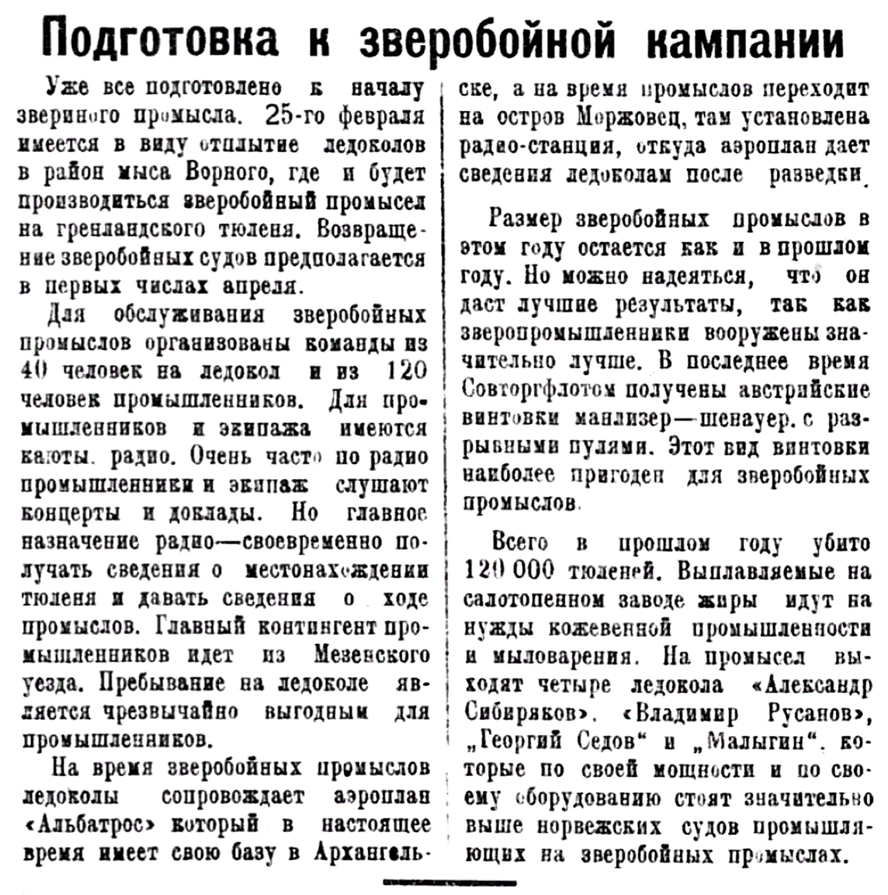 Первая и вторая разведки самолета вылетевшего из г. Архангельска, по розыску зверя в Белом море дала блестяще результаты. Обнаружены сплошные залежи тюленя. Зверобойный лов начался 2 марта.