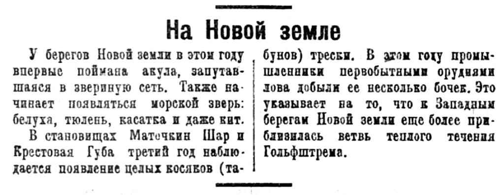 В становищах Маточкин Шар и Крестовая Губа третий год наблюдается появление целых косяков (табунов) трески. В этом году промышленники первобытными орудиями лова добыли ее несколько бочек. Это указывает на то, что к Западным берегам Новой земли еще более приблизилась ветвь теплого течения Гольфштрема.