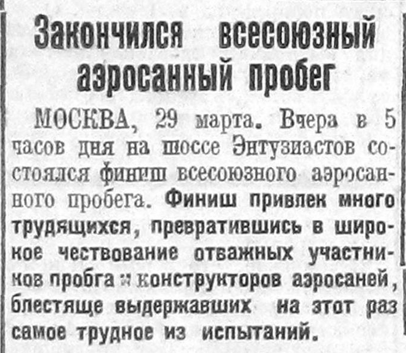 28 января в Москве, на Владимирском шоссе состоялся пробный пробег аэросаней, которые пойдут в пробег в начале февраля по маршруту: Москва - Ярославль - Кострома - Вятка - Пермь - Казань - Владимир - Москва, протяжением в 3000 километров, из которых 2400 кил. по проселочным дорогам и почтовым трактам и лишь 600 кил. по шоссе. Пробег имеет две цели: ознакомление населения с новым видом зимнего транспорта, могущим сыграть большую роль как в народном хозяйстве, так и в обороне страны, а также выявление лучших конструкций аэросаней.