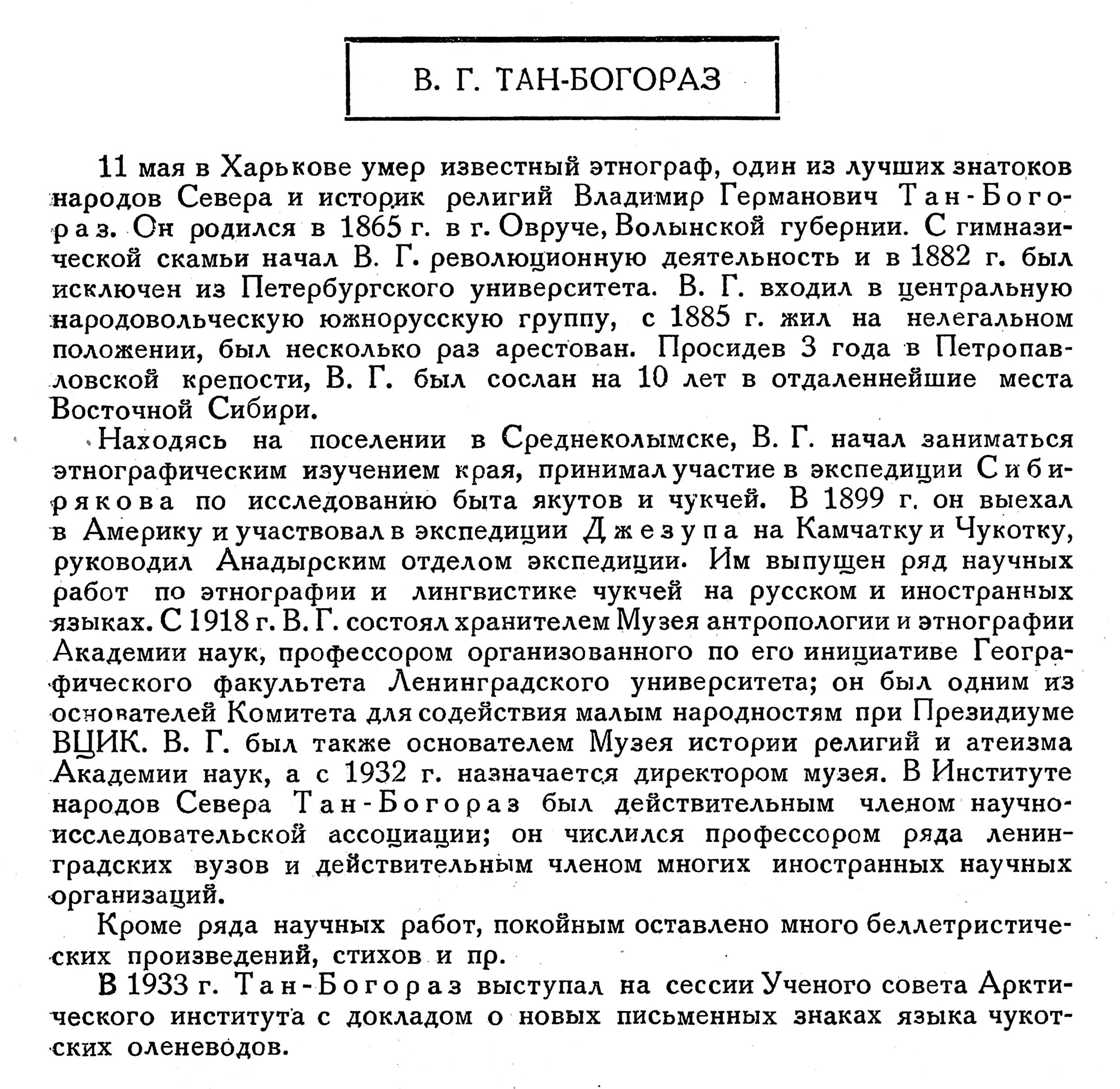 11 мая в Харькове умер известный этнограф, один из лучших знатоков народов Севера и историк религий Владимир Германович Тан-Богораз. Он родился в 1865 г. в г. Овруче, Волынской губернии. С гимназической скамьи начал В. Г. революционную деятельность и в 1882 г. был исключен из Петербургского университета. В. Г. входил в центральную народовольческую южнорусскую группу, с 1885 г. жил на нелегальном положении, был несколько раз арестован. Просидев 3 года в Петропавловской крепости, В. Г. был сослан на 10 лет в отдаленнейшие места Восточной Сибири.