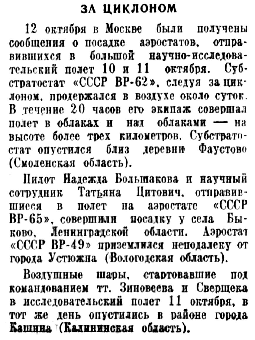 — Я стартовала из Москвы 14 мая в 20 часов 53 минуты с заданием установить женский рекорд продолжительности полета на сферическом аэростате. Полет проходил в неблагоприятных метеорологических условиях: плотная облачность, снегопад. Днем летела на высоте З-х тысяч метров со скоростью 35—40 километров в час. На этой высоте температура воздуха доходила до 8 градусов холода. Ночью потолок сокращался до 300—500 метров. Сокращалась и скорость. В это время полета скорость равнялась 20—25 километров в час.