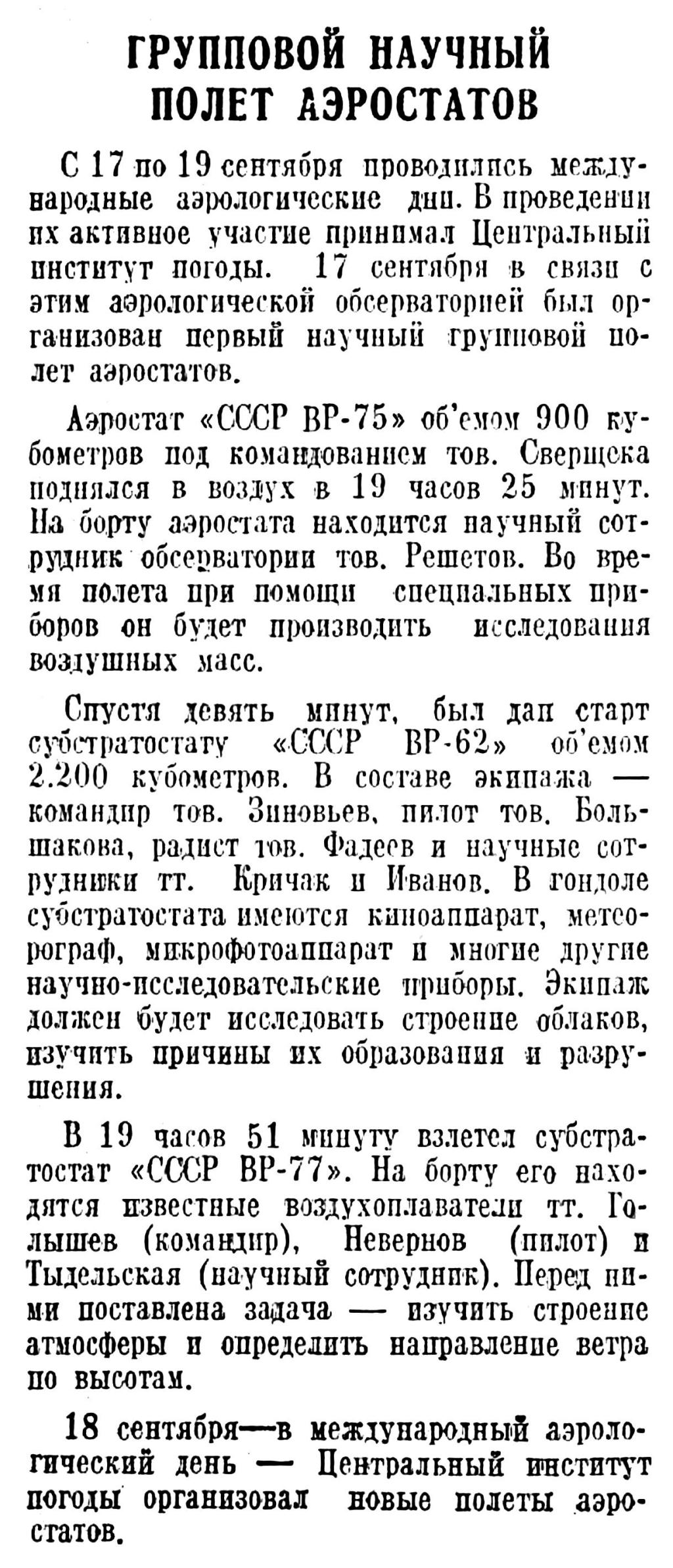 Исключительно большую работу провели в эти дни Центральный институт погоды и его аэрологическая обсерватория. Они впервые организовали два научных групповых полета аэростатов. Вчера от аэростатов были получены сообщения об успешном окончании перелетов. Субстратостат «СССР ВР—62», вылетевший вечером 17 сентября, благополучно опустился близ станции Обозерской (Северная ж. д.), продержавшись в воздухе свыше 18 часов. Стартовавший в тот же вечер субстратостат «СССР ВР—77» опустился около станции Няндома (Северная ж. д.), а аэростат «СССР ВР—75» совершил посадку в предместье Архангельска, пролетев около 900 километров. Аэростаты, отправившиеся в научный полет утром 18 сентября, в тот же день благополучно приземлились у станции Родионово (Ярославская ж. д.).