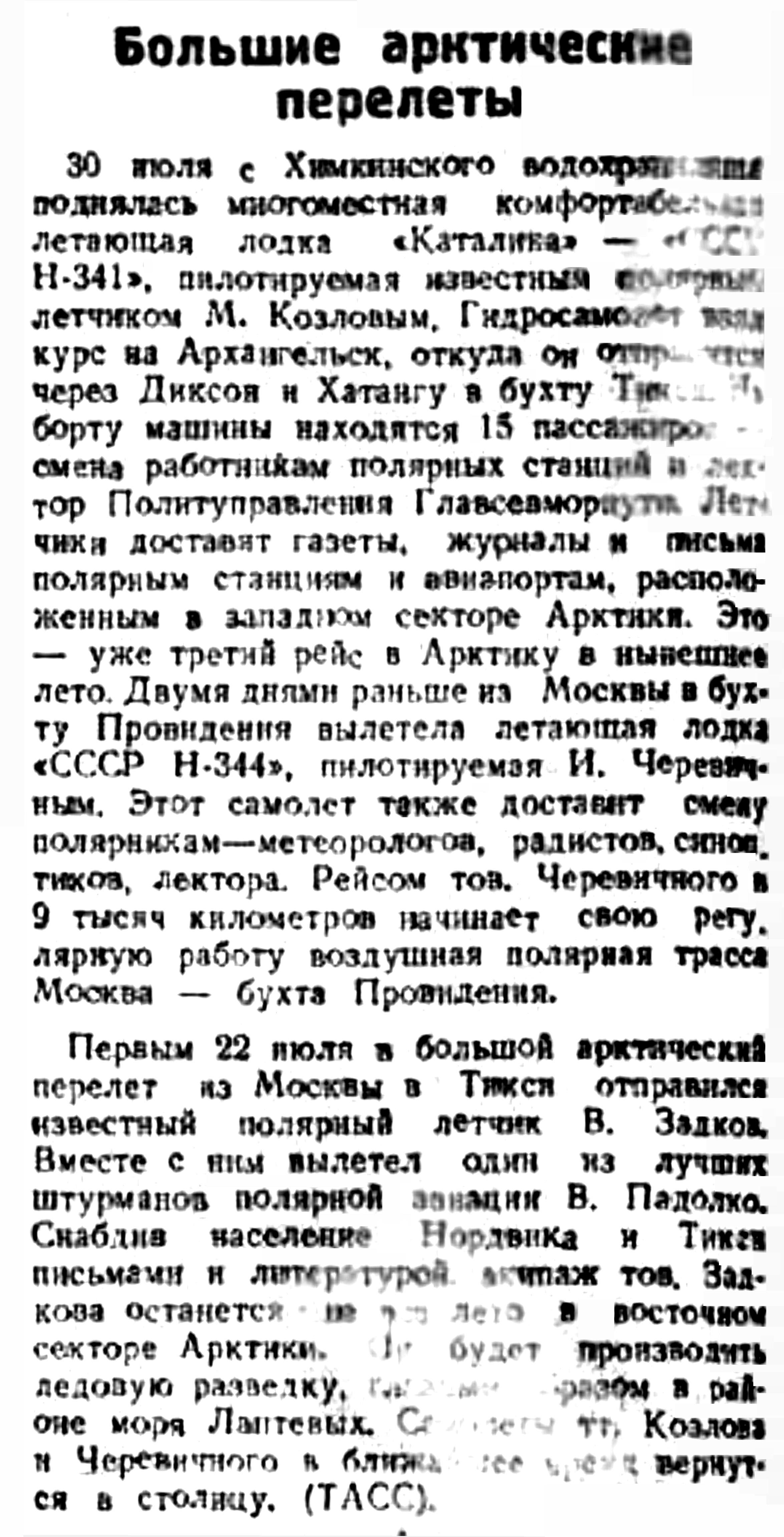 30 июля с Химкинского водохранилища поднялась многоместная комфортабельная летающая лодка "Каталина" — "СССР Н-341", пилотируемая известным полярным летчиком М. Козловым. Гидросамолет взял курс на Архангельск, откуда он отправится через Диксон и Хатангу в бухту Тикси. На борту машины находятся пассажиры - смена работников полярных станций и лектор Политуправления Главсевморпути. Летчики доставят газеты, журналы и письма полярным станциям и авиапортам, расположенным а западном секторе Арктики. Это — уже третий рейс в Арктику в нынешнее лето. Двумя днями раньше из Москвы в бухту Провидения вылетела летающая лодка "СССР Н-344", пилотируемая И. Черевичным. Этот самолет также доставит смену полярникам — метеорологов, радистов, синоптиков, лектора. Рейсом тов. Черевичного в 9 тысяч километров начинает свою регулярную работу воздушная полярная трасса Москва — бухта Провидения.