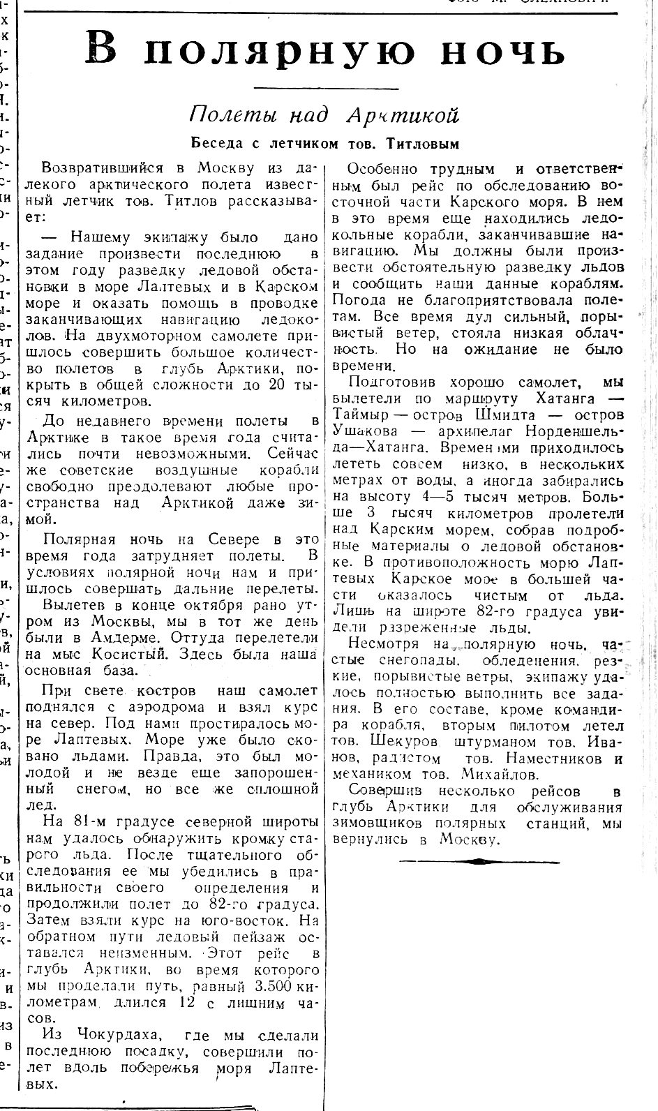 13 ноября из Москвы в большой облет западнаго сектора Арктики отправился самолет полярной авиации Главсевморпути, пилотируемый М. Титловым. Маршрут полета: Архангельск — Дудинка — Диксон — Дудинка. Отсюда тов. Титлов совершит нисколько рейсов на мыс Косистый и в бухту Тикси. Закончив переброску грузов, он перелетит в Усть-Оленек и на Ангарские каменноугольные копи, затем вернется в бухту Тикси. Весь перелет рассчитан на десять дней.