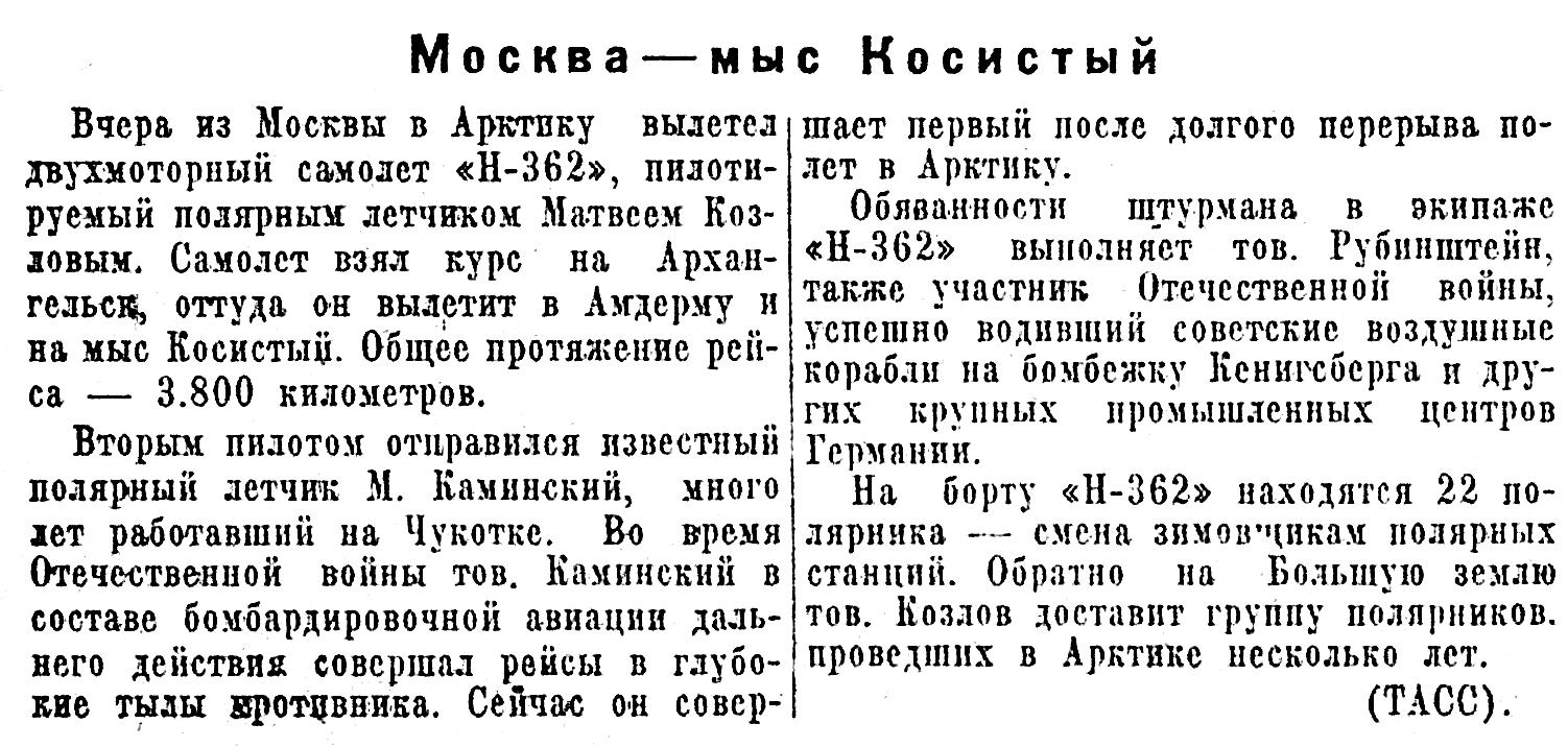 Вторым пилотом отправился известный полярный летчик М. Каминский, много лет работавший на Чукотке. Во время Отечественной войны тов. Каминский в составе бомбардировочной авиации дальнего действия совершал рейсы в глубокие тылы противника. Сейчас он совершает первый после долгого перерыва полет в Арктику.