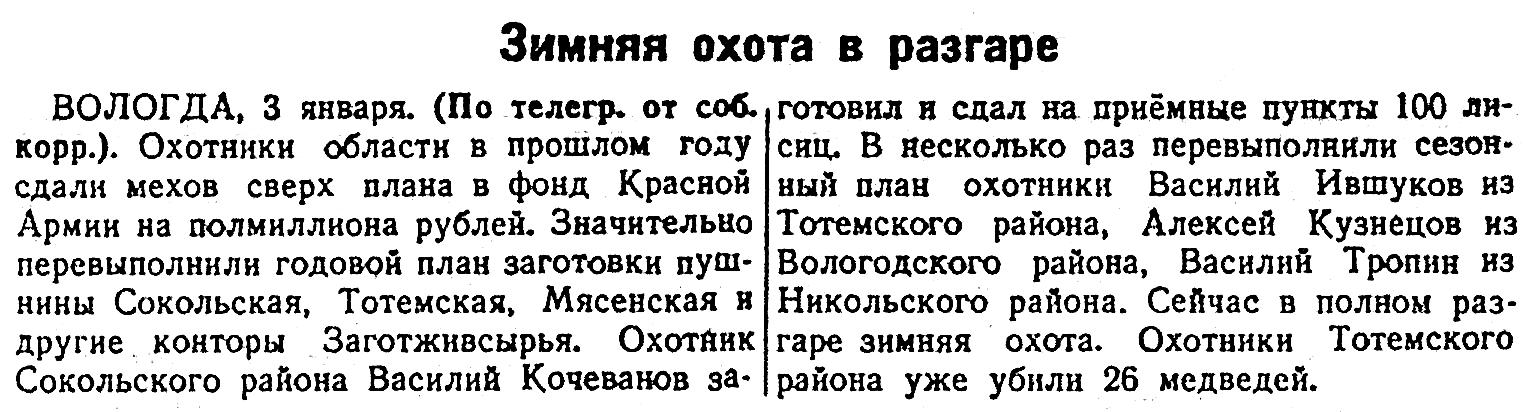 ВОЛОГДА, 3 января. (По телегр, от соб. корр.). Охотники области в прошлом году сдали мехов сверх плана в фонд Красной Армии на полмиллиона рублей. Значительно перевыполнили годовой план заготовки пушнины Сокольская, Тотемская, Мясенская и другие конторы Заготживсырья. Охотник Сокольского района Василий Кочеванов заготовил и сдал на приёмные пункты 100 лисиц. В несколько раз перевыполнили сезонный план охотники Василий Ившуков из Тотемского района, Алексей Кузнецов из Вологодского района, Василий Тропин из Никольского района. Сейчас в полном разгаре зимняя охота. Охотники Тотемского района уже убили 26 медведей.