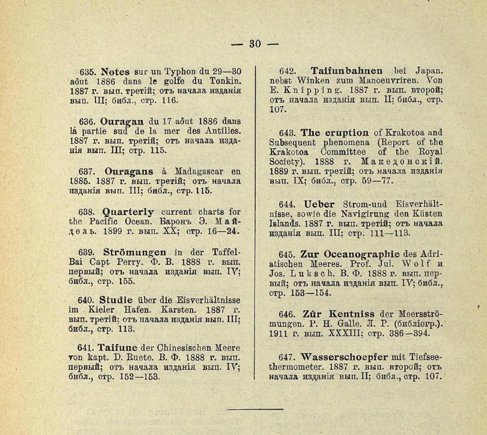 635. Notes sur un Typhon du 29—30 aout 1886 dans le golfe du Tonkin. 1887 г. вып. третий; от начала издания вып. III; библ., стр. 116.