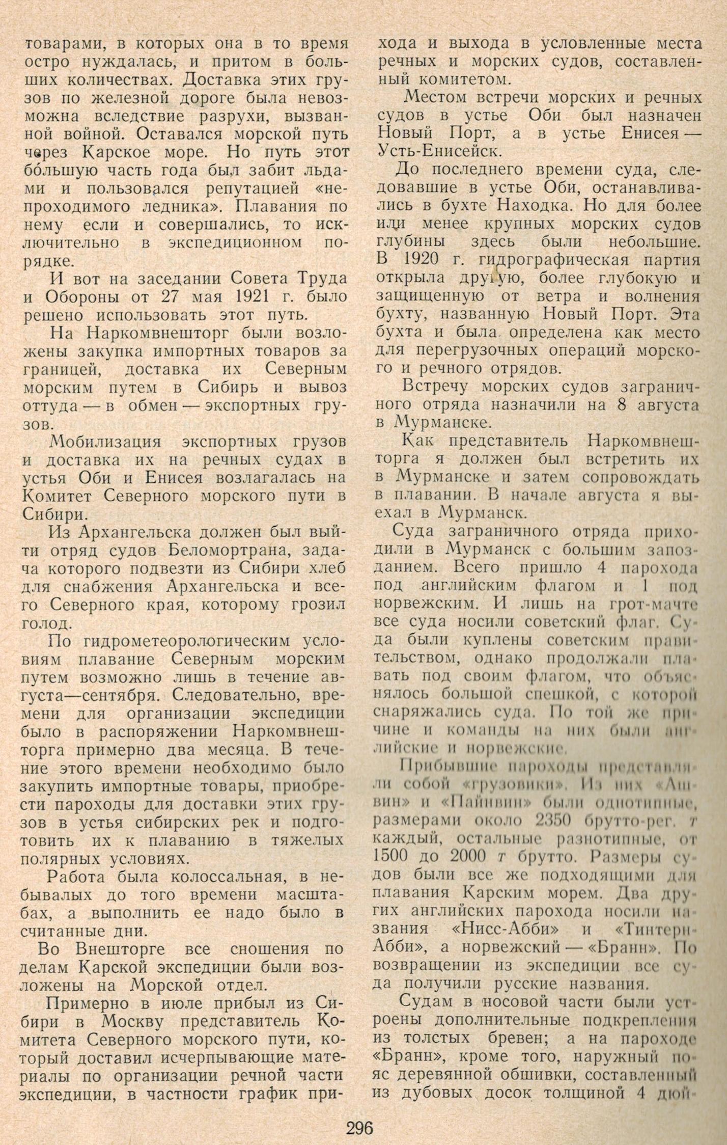 товарами, в которых она в то время остро нуждалась, и притом в больших количествах. Доставка этих грузов по железной дороге была невозможна вследствие разрухи, вызванной войной. Оставался морской путь через Карское море. Но путь этот большую часть года был забит льдами и пользовался репутацией «непроходимого ледника». Плавания по нему если и совершались, то исключительно в экспедиционном порядке.