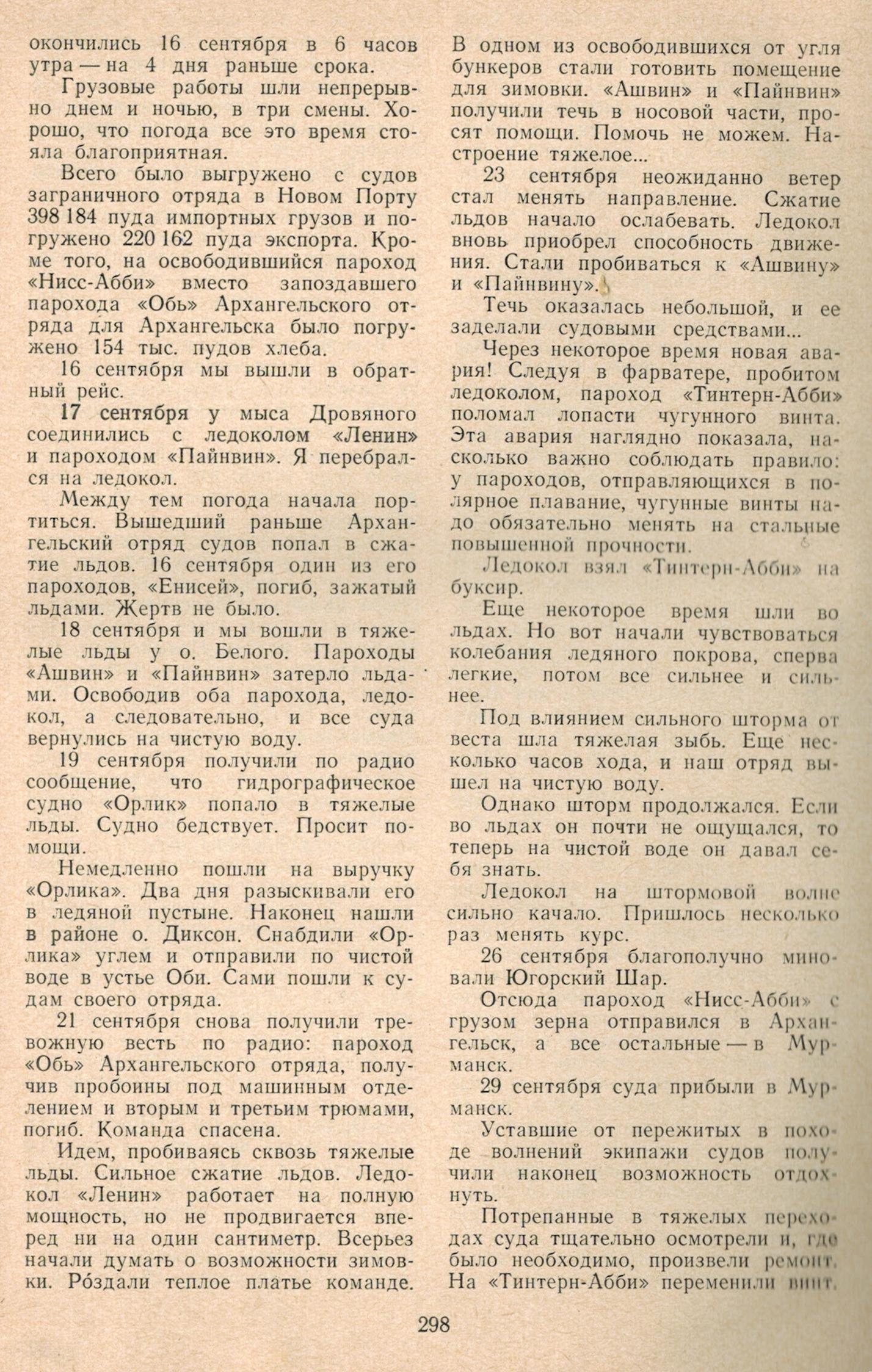 18 сентября и мы вошли в тяжелые льды у о. Белого. Пароходы «Ашвин» и «Пайнвин» затерло льдами. Освободив оба парохода, ледокол, а следовательно, и все суда вернулись на чистую воду.