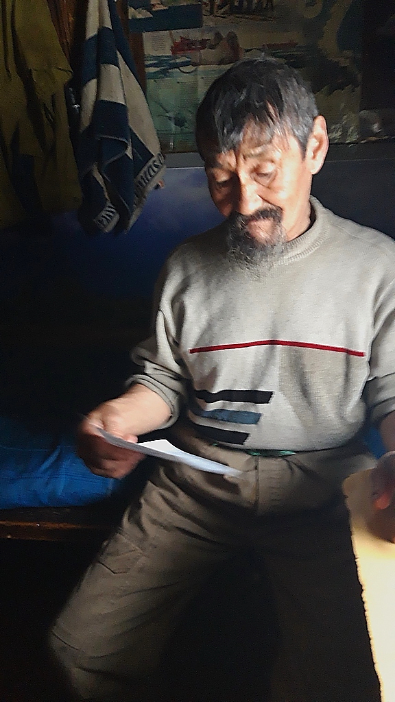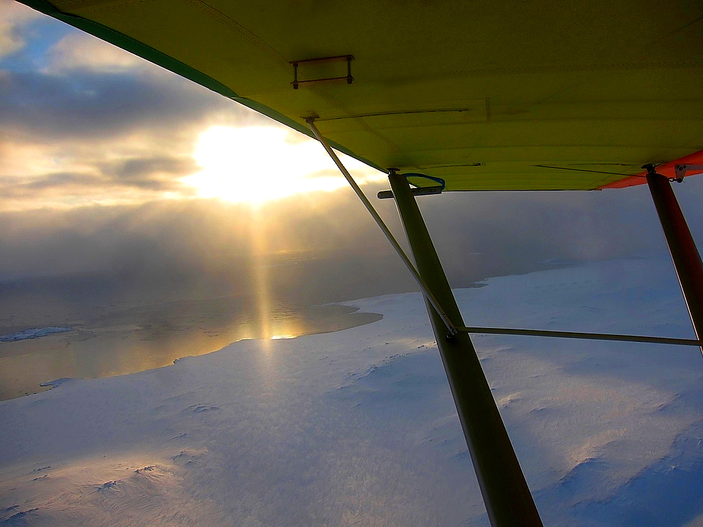На улице похолодало до минус 13 градусов, я начал готовить самолет с 10 часов и очень помог снегоход Ивана Петровича. Вначале я Бураном закрыл Северок от ветра, пока грел примусом двигатель, а после уже оттащил самолет веревкой на вылет. В магазинчик заехал попрощался с Еленой Юльевной и вместе с Петровичем поехали к самолету. Тут и состоялось одно из самых замечательных событий этой экспедиции. Вспоминаю как в декабре из-за сложной погоды я не смог взять в полет с собой Петровича и насколько он был расстроен.
