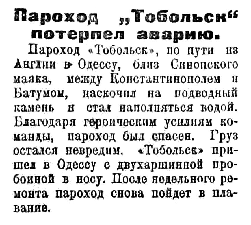 Пароход "Тобольск", по пути из Англии в Одессу, близ Синопского маяка, между Константинополем и Батумом, наскочил на подводный камень и стал наполняться водой. Благодаря героическим усилиям команды, пароход был спасен. Груз остался невредим. "Тобольск" пришел в Одессу с двухаршинной пробоиной в носу. После недельного ремонта пароход снова пойдет в плавание.