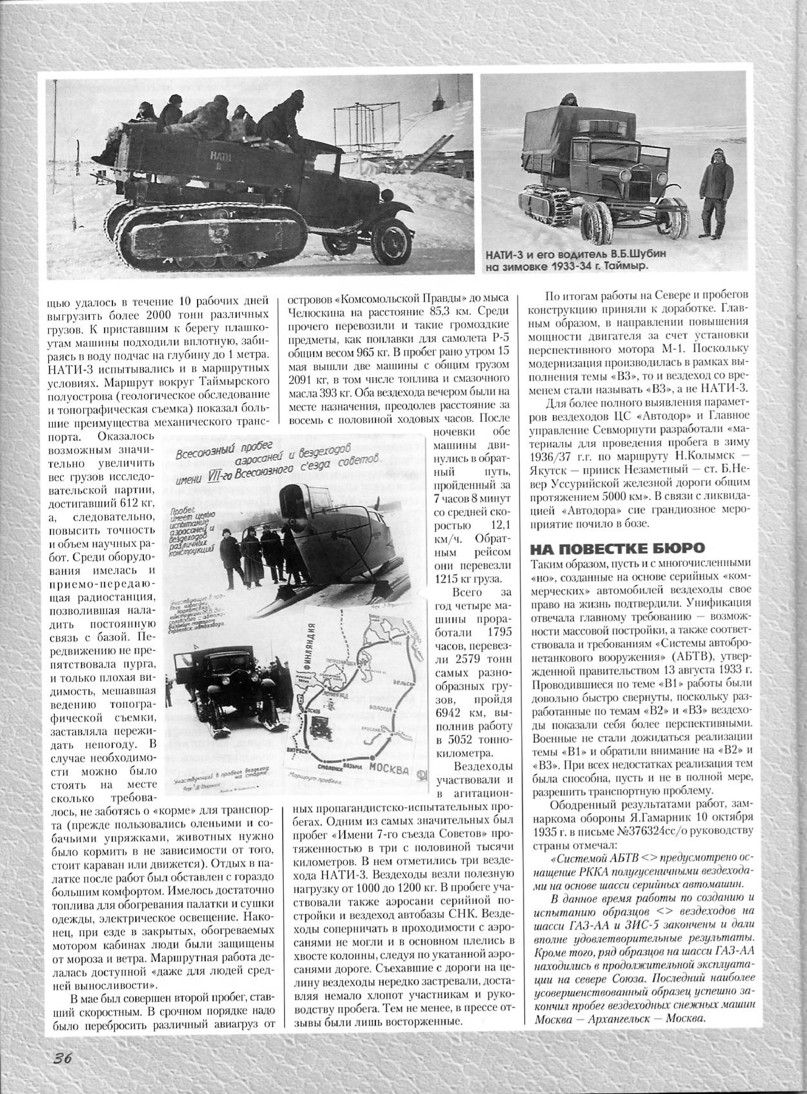 В данное время работы по созданию и испытанию образцов <> вездеходов на шасси ГАЗ-АА и ЗИС-5 закончены и дали вполне удовлетворительные результаты. Кроме того, ряд образцов на шасси ГАЗ-АА находились в продолжительной эксплуатации на севере Союза. Последний наиболее усовершенствованный образец успешно закончил пробег вездеходных снежных машин Москва — Архангельск — Москва.