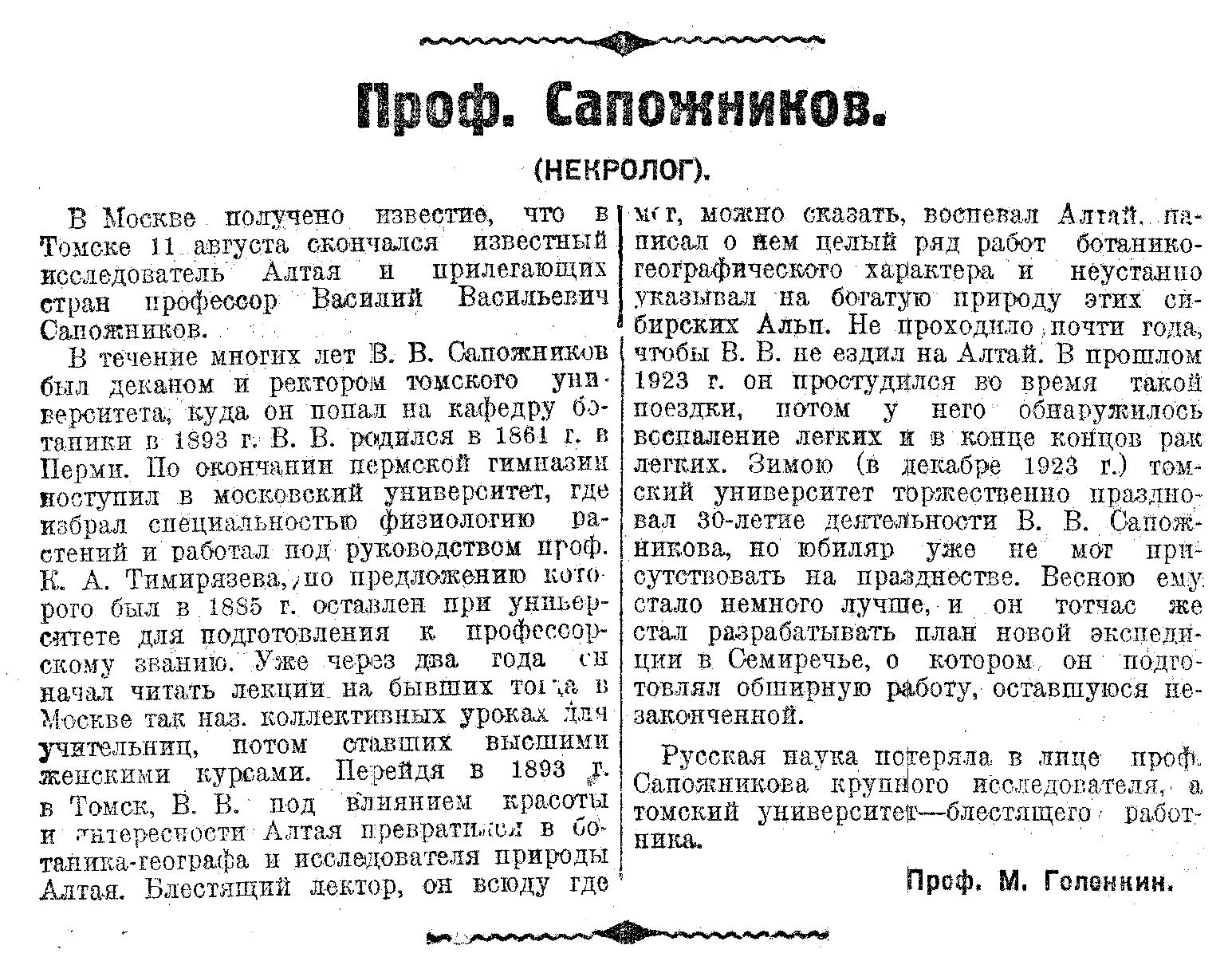 В Москве получено известие, что в Томске 11 августа скончался известный исследователь Алтая и прилегающих стран профессор Василий Васильевич Сапожников.