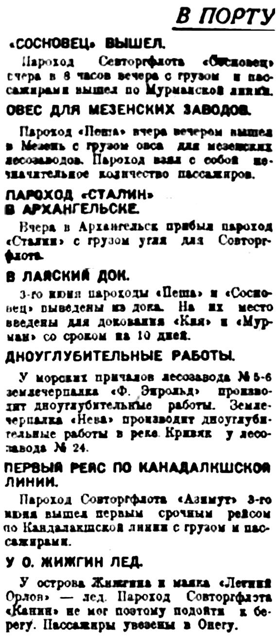 ♦ Вчера вечером пароход «Канин» вышел срочным рейсом по Онежской линии.