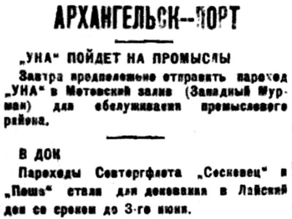 ♦ Вчера вечером пароход «Канин» вышел срочным рейсом по Онежской линии.