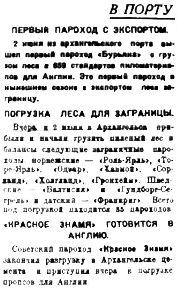 ГДЕ НАШИ МОРЯКИ.«Раза Люксембург» выгружает кожсырье в Ливерпуле. «Красный Октябрь» 10 июня прибыл в Бляйт для бункеровки. «Аркос» 12 июня выше из Ковды в Кардиф с пиломатериалами. «Томский» ремонтируется в Ленинграде. «Сорока» на пути в Лондон. «Рабочий» 10 июня прибыл в Бляйт, где грузится углем для Архангельска. «Искра» на пути из Евпатории в Архангельск. Ее прибытие ожидается 20 июня. «Крестьянин» на пути из Мурманска в Гамбург. «Красное Знамя» на пути из Архангельска в Вест Хартлепуль.