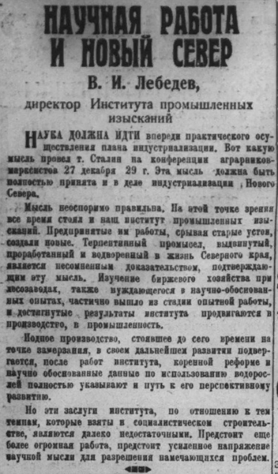 Статья В. И. Лебедева в газете "Правда Севера, 1930, № 45 от 24 февраля: