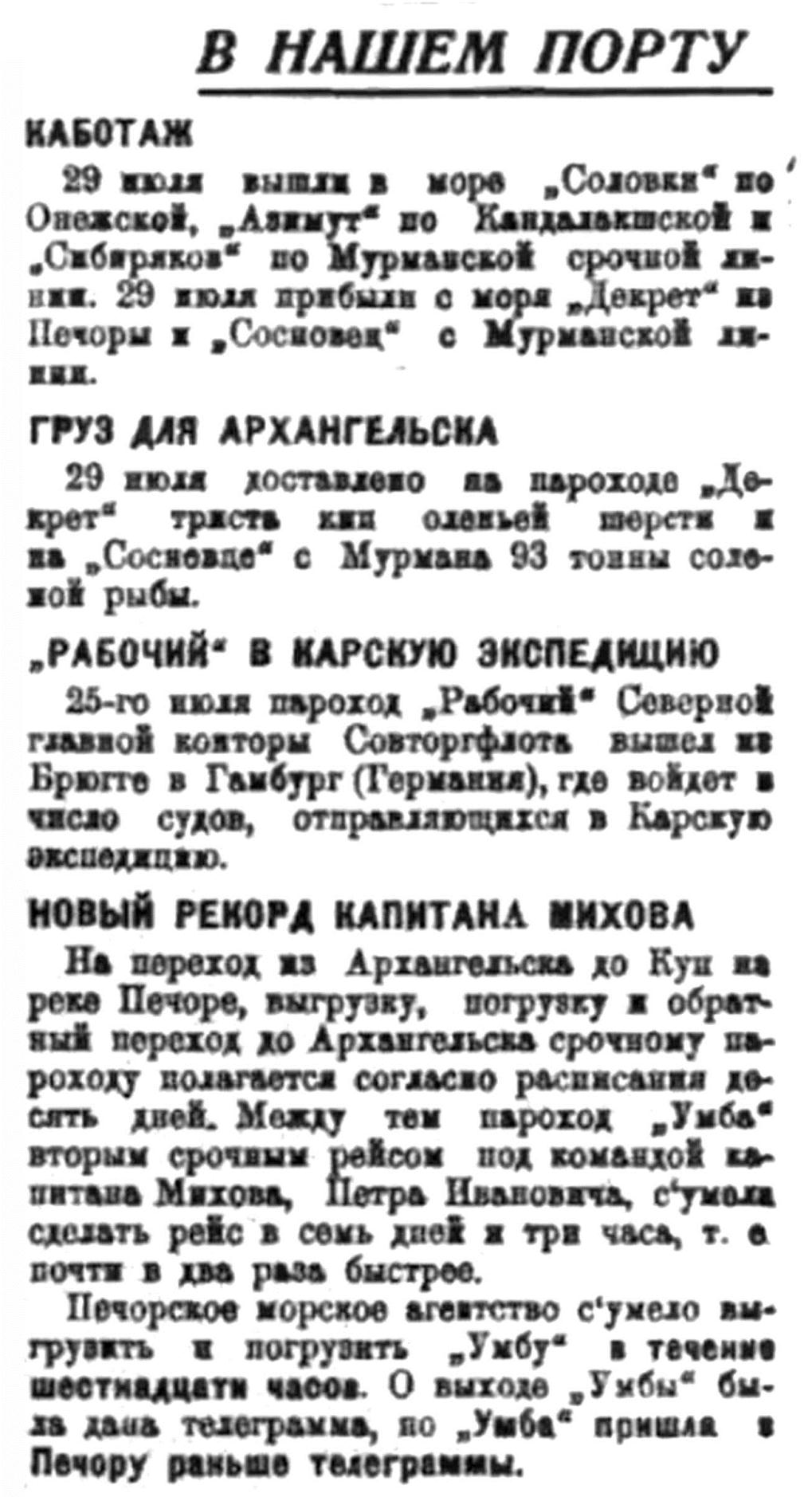 Сегодня уйдет в море по Мезенской линии срочным рейсом пароход "Канин" и пришла с Печоры срочным рейсом "Умба". Вчера пришел из Кандалакшского залива "Азимут", с Онежской линии "Соловки" и с Мурманской "Сибиряков".