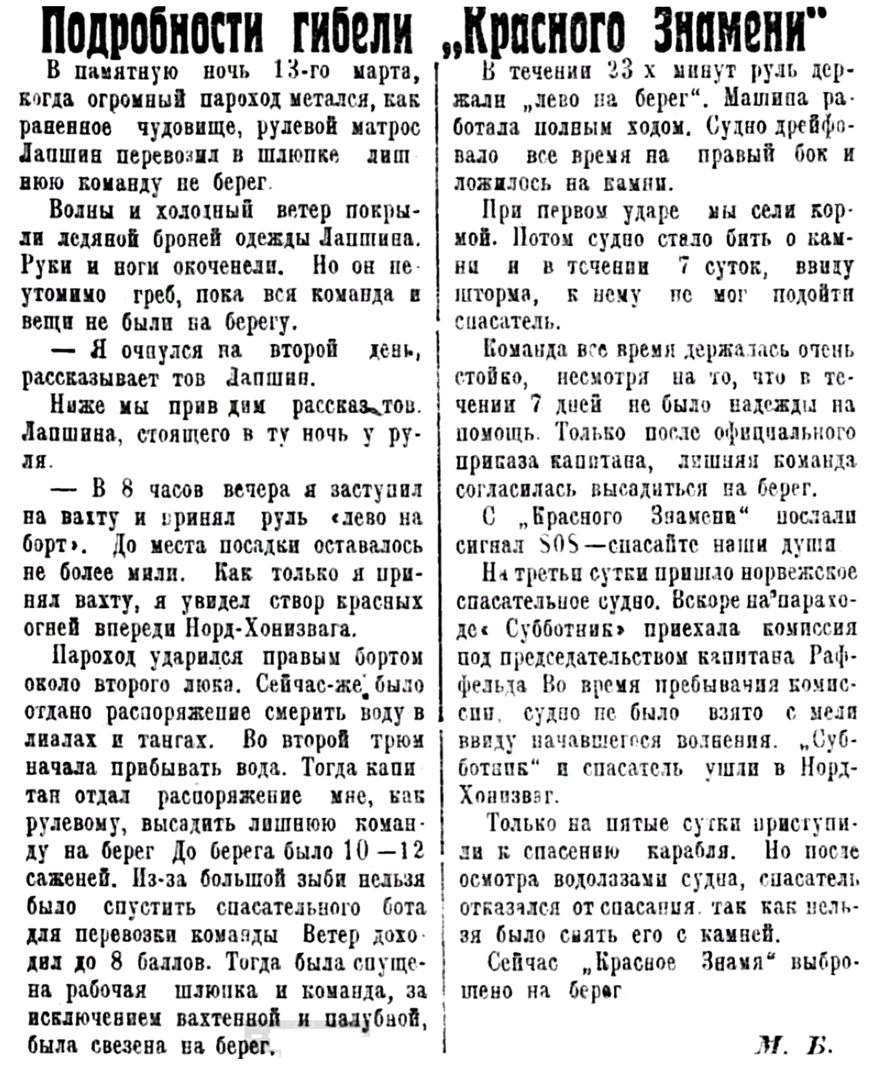 Ниже мы приводим рассказ тов. Лапшина, стоящего в ту ночь у руля.