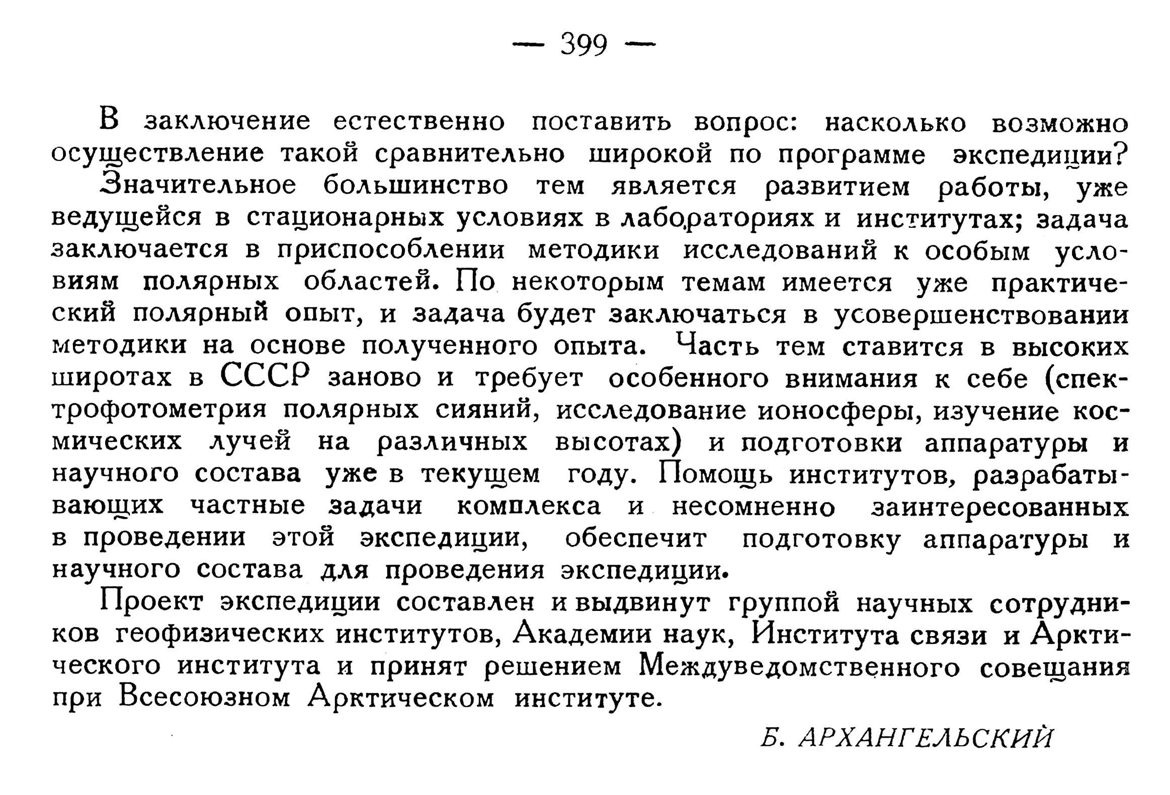 Кроме научной и практической ценности самих результатов предположенной экспедиции, ее следует рассматривать как расширение методической базы, освоение и приспособление к условиям работы на Севере некоторых новых методов исследований, уже освоенных в институтах и обсерваториях СССР. В этом отношении комплексная геофизическая экспедиция явится несомненным шагом вперед в развитии полярных исследований и свяжет исследования 2 Международного полярного года с будущим международным полярным годом цепью самостоятельных, исследований советских научных работников.