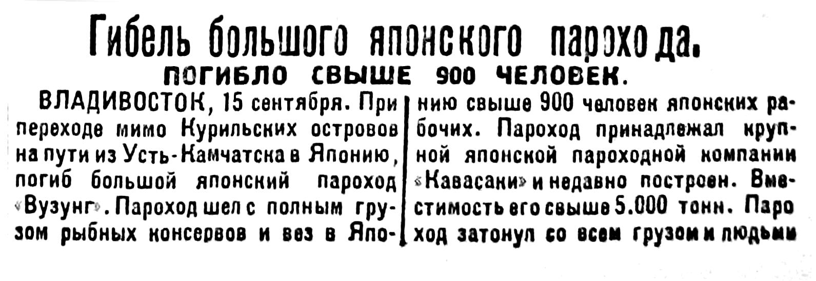 ВЛАДИВОСТОК, 15 сентября. При переходе мимо Курильских островов на пути из Усть-Камчатска в Японию, погиб большой японский пароход «Вузунг». Пароход шел с полным грузом рыбных консервов и вез в Японию свыше 900 человек японских рабочих. Пароход принадлежал крупной японской пароходной компании «Кавасаки» и недавно построен. Вместимость его свыше 5.000 тонн. Пароход затонул со всем грузом и людьми.