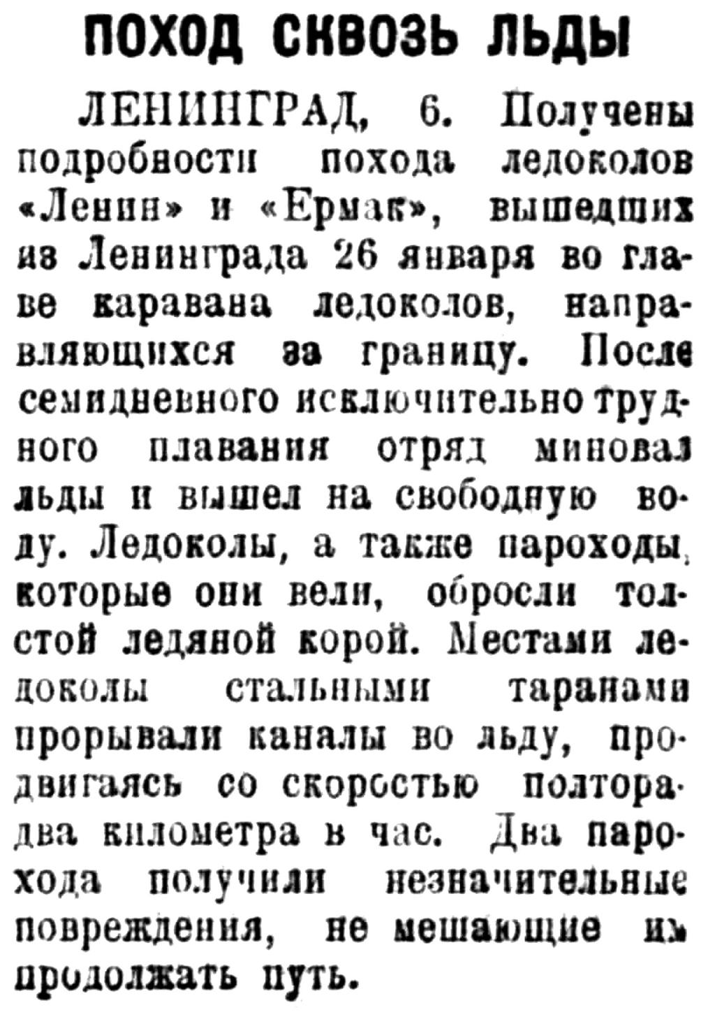ЛЕНИНГРАД, 6. Получены подробности похода ледоколов «Ленин» и «Ермак», вышедших из Ленинграда 26 января во главе каравана ледоколов, направляющихся за границу. После семидневного исключительно трудного плавания отряд миновал льды и вышел на свободную воду. Ледоколы, а также пароходы, которые они вели, обросли толстой ледяной корой. Местами ледоколы стальными таранами прорывали каналы во льду, продвигаясь со скоростью полтора-два километра в час. Два парохода получили незначительные повреждения, не мешающие им продолжать путь.
