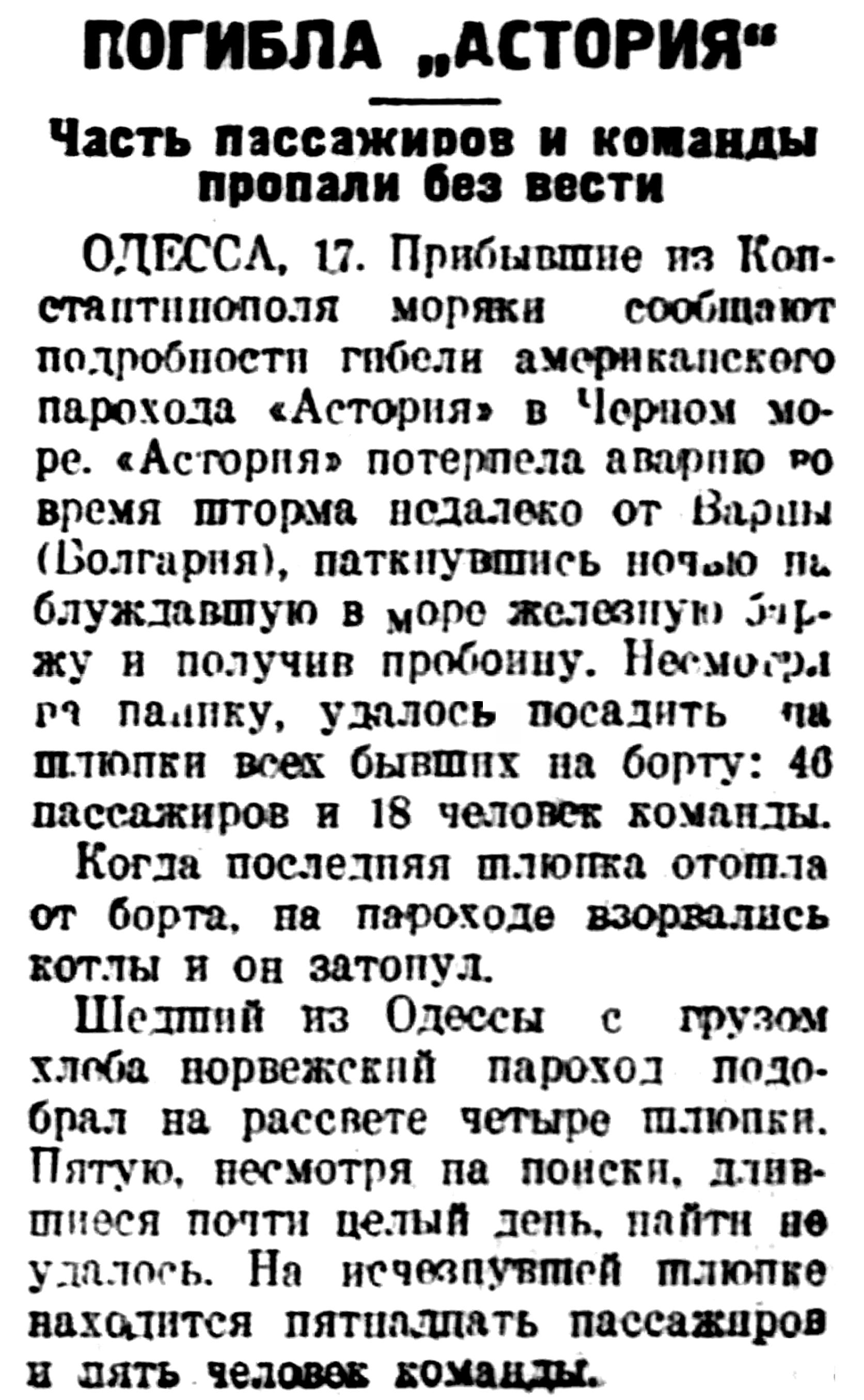 Шедший из Одессы с грузом хлеба норвежский пароход подобрал на рассвете четыре шлюпки. Пятую, несмотря на поиски, длившиеся почти целый день, найти не удалось. На исчезнувшей шлюпке находится пятнадцать пассажиров и пять человек команды.