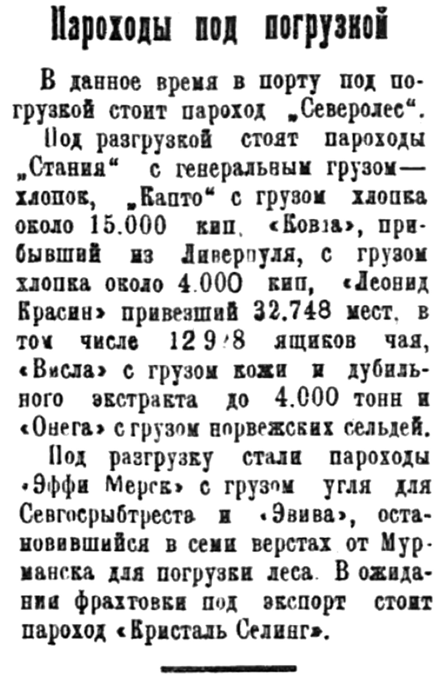 Под разгрузку стали пароходы "Эффи Мерск" с грузам угля для Севгосрыбтреста и "Эвива", остановившийся в семи верстах от Мурманска для погрузки леса. В ожидании фрахтовки под экспорт стоит пароход "Кристаль Селинг".