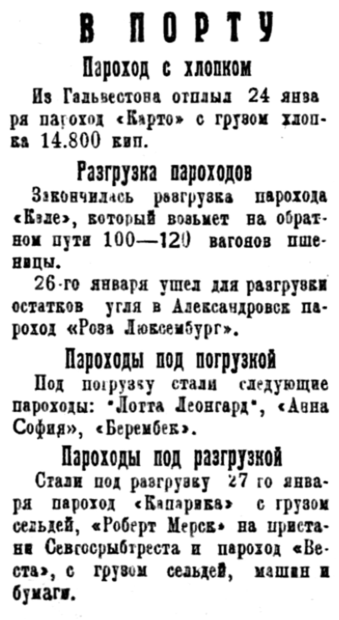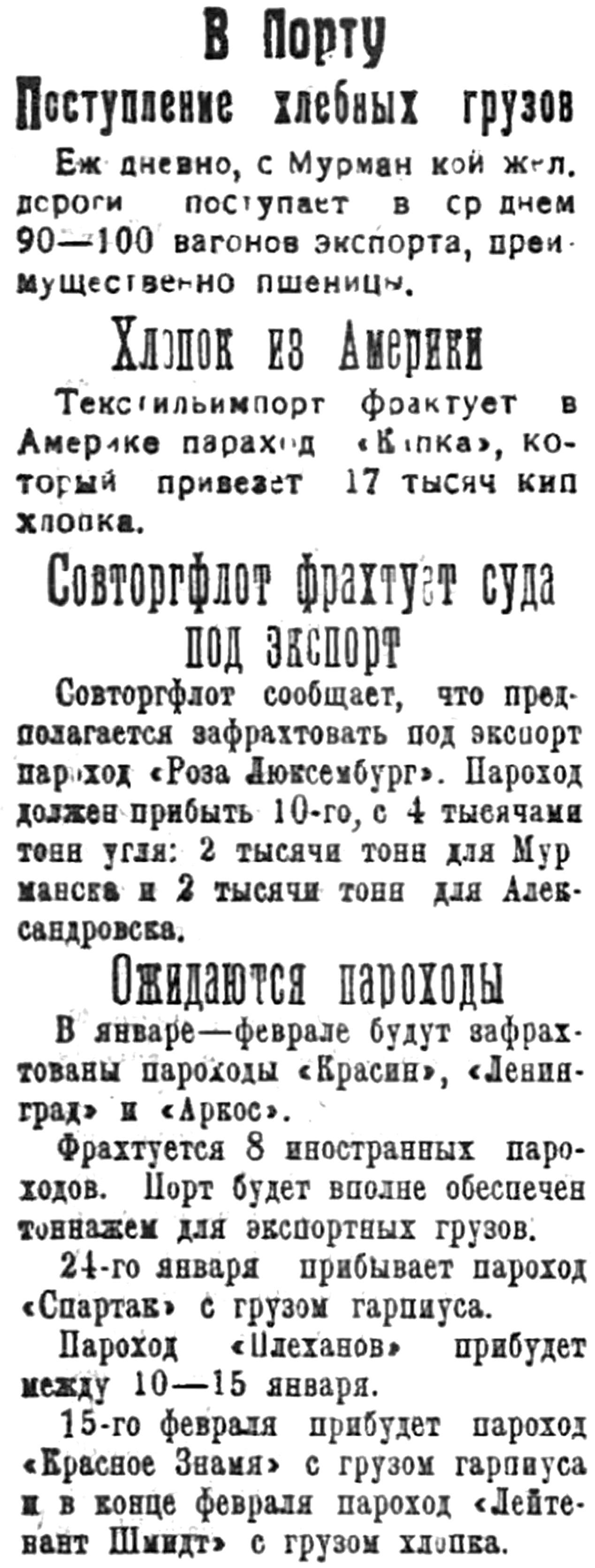 15-го февраля прибудет пароход "Красное Знамя" с грузом гарпиуса и в конце февраля пароход "Лейтенант Шмидт" с грузом хлопка.