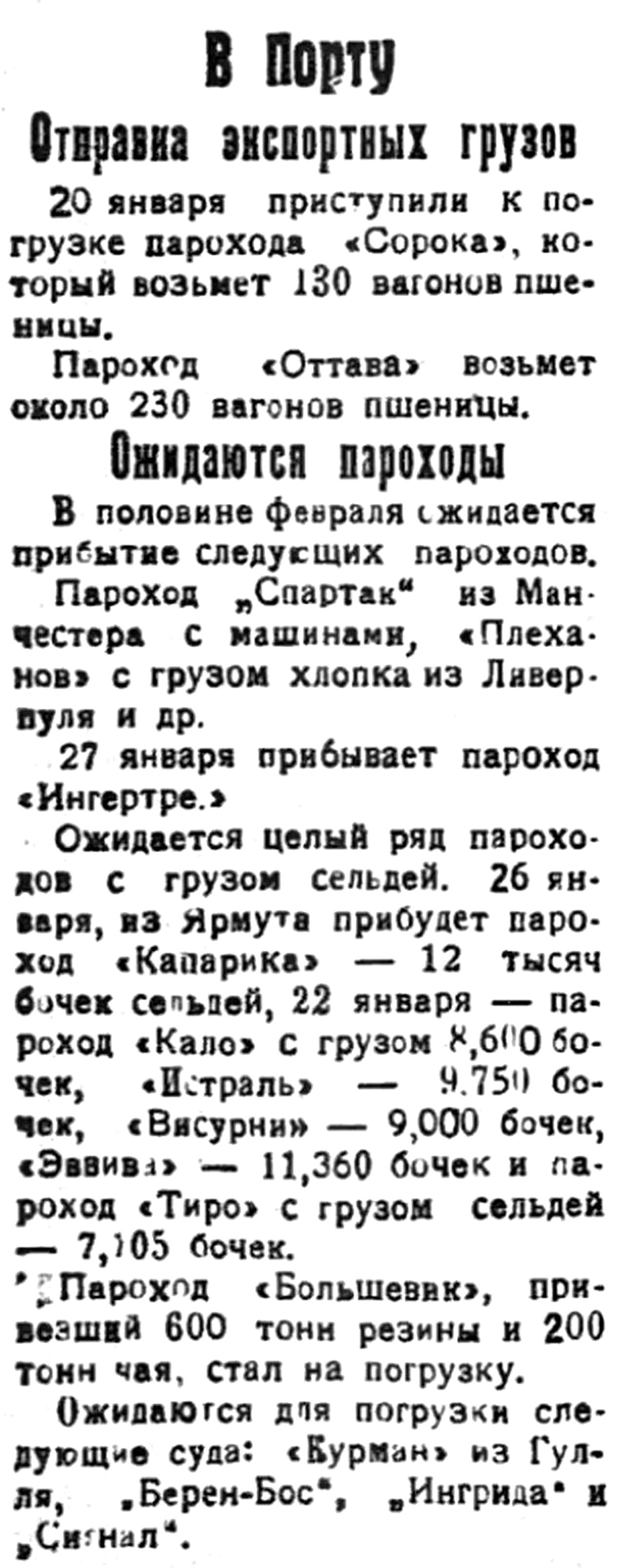 В порту под погрузкой стоят пароходы "Плеханов" с грузом в 5.000 тонн, "Яков Свердлов" — 2.700 тонн и "Фридрихсборг" — 2.700 тонн. С грузом ушли пароходы: "Роберт Мерск" — 2.050 тонн, "Орион" — 2.000 тонн, "Висургис" — 1.600 тонн, "Ингрид" — 2.900 т., "Роза Люксембург" — 4.500 тонн, "Лаура Мерск" — 2.500 тонн, "Спартак" — 2.050 тонн, "Большевик" — 1.800 тонн, "Лейтенант Шмидт" — 2.600 тонн, "Курслак" — 2.250 т., "Оренборг" — 2.400 т., "Кемь" — 2.100 т., "Неутраль" — 1.650 тонн, "Фане" — 2.900 тонн, "Джонсборг" — 2.100 тонн.