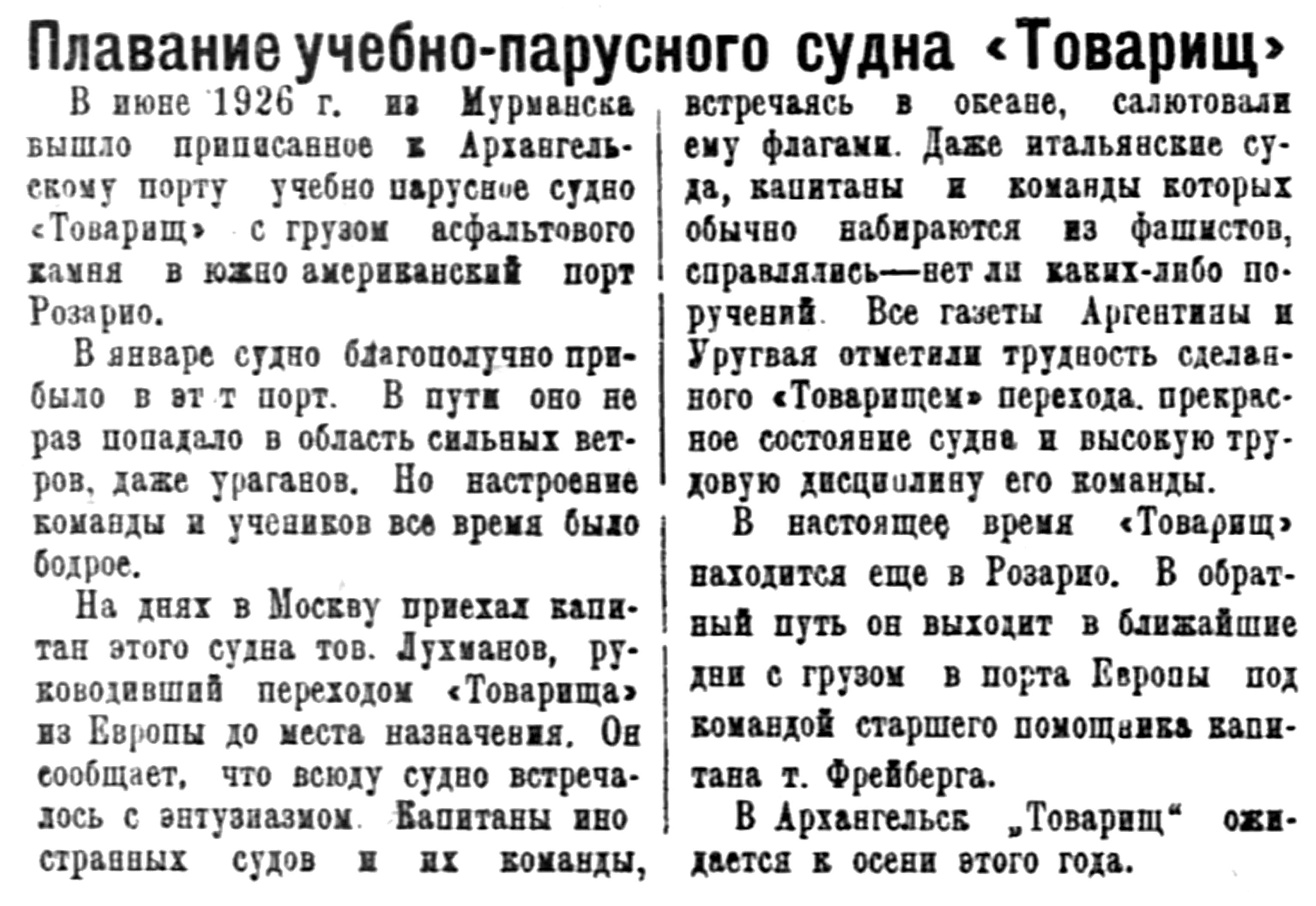 В июне 1926 г. из Мурманска вышло приписанное к Архангельскому порту учебно-парусное судно "Товарищ" с грузом асфальтового камня в южно-американский порт Розарио.