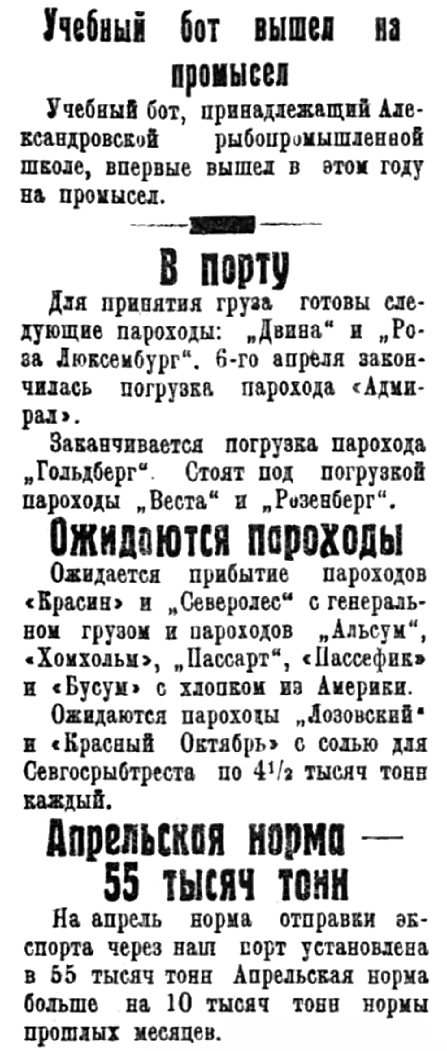 Для принятия груза готовы следующие пароходы: "Двина" и "Роза Люксембург". 6-го апреля закончилась погрузка парохода "Адмирал".