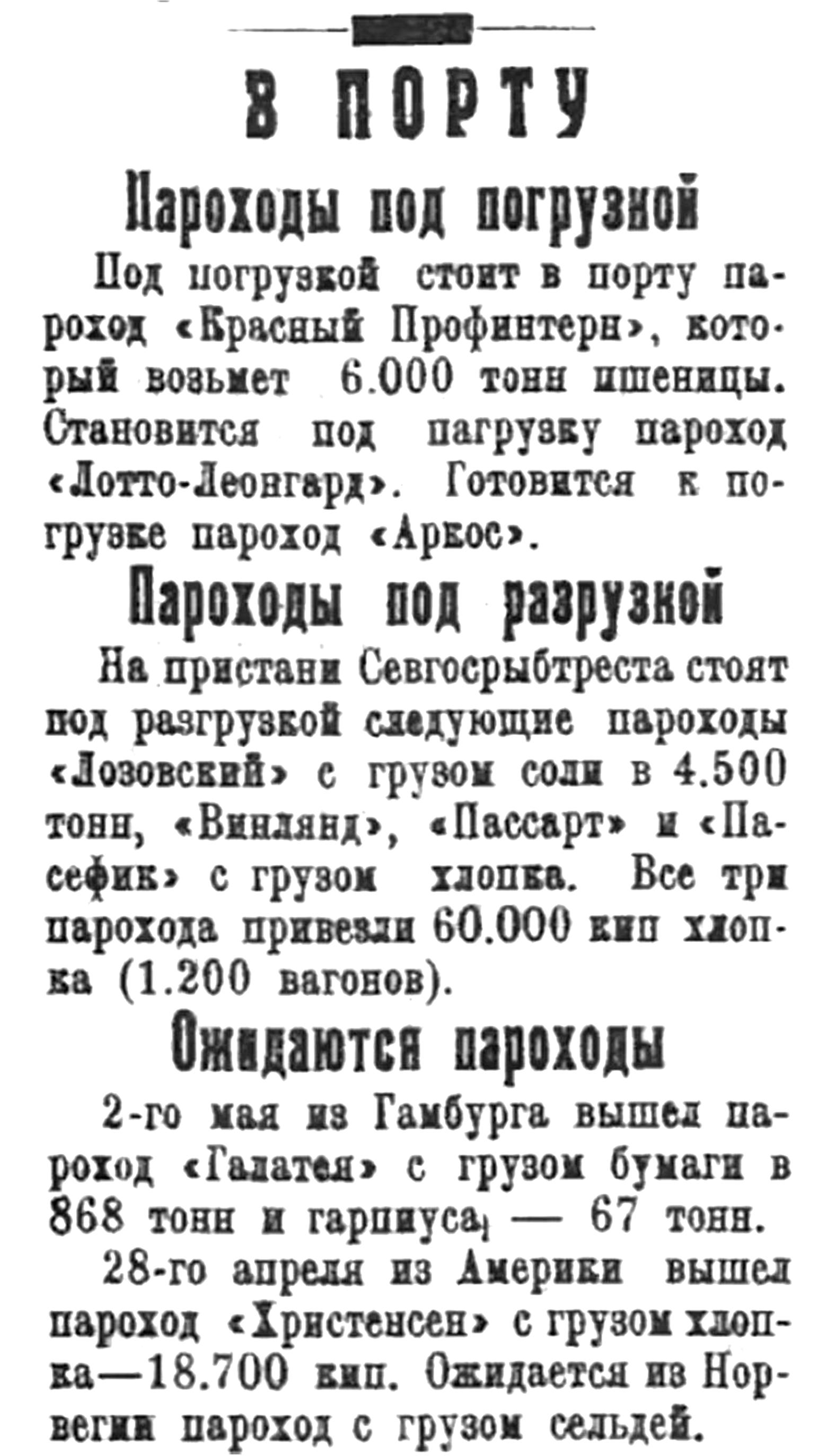Под погрузкой стоит в порту пароход "Красный Профинтерн", который возьмет 6.000 тонн пшеницы. Становится под погрузку пароход "Лотто-Леонгард". Готовится к погрузке пароход «Аркос».