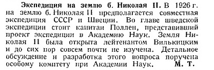 экспедиция СССР и Швеции. Во главе шведской экспедиции стоит капитан Поллен, представивший проект экспедиции в Академию Наук. Земля Николая II была открыта лейтенантом Вилькицким и до сих пор совсем почти не изучена. Детальное обсуждение и разработка этого вопроса поручена особому комитету при Академии Наук. М. Т.