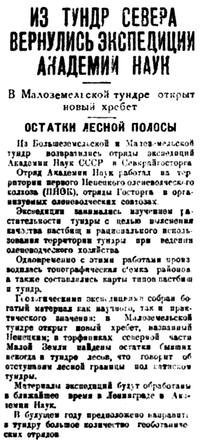 Из Большеземельской и Малоземельской тундр возвратились отряды экспедиций Академии Наук СССР и Севкрайгосторга. Отряд Академии Наук работал на территории первого Ненецкого оленеводческого колхоза (ПНОК), отряды Госторга в организуемых оленеводческих совхозах.