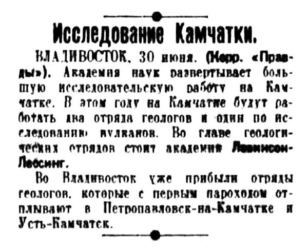 ВЛАДИВОСТОК. 30 июня. (Корр. «Правды»). Академия наук развертывает большую исследовательскую работу на Камчатке. В этом году на Камчатке будут работать два отряда геологов и один по исследованию вулканов. Во главе геологических отрядов стоит академик Левинсон-Лессинг.